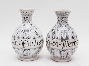Coppia di vasi da farmacia in ceramica smaltata, Bottega Gatti