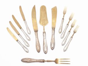 composto da 8 forchette, 10 coltelli, 8 cucchiai, 10 forchettine e coltellini da frutta, 11 cucchiai da dolce, [..]