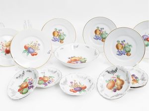 coppa h cm 5, diam cm 20,5 (13) XX secolo decorati con motivo di frutta e completi per sei persone, uno con bordo [..]