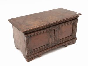 h cm 35x72x34 XVII secolo fronte a due formelle, intagliato con motivi geometrici, piedi a mensola, lievi dif [..]