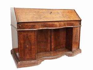 Scrittoio a ribalta impiallacciato in radica e piuma di noce