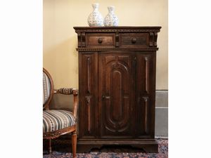 h cm 122x82x49 XVIII secolo cappello aggettante con gocciolatoio e due cassettini sottostanti, uno sportello [..]