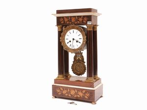 Orologio a tempietto impiallacciato in noce e altre essenze