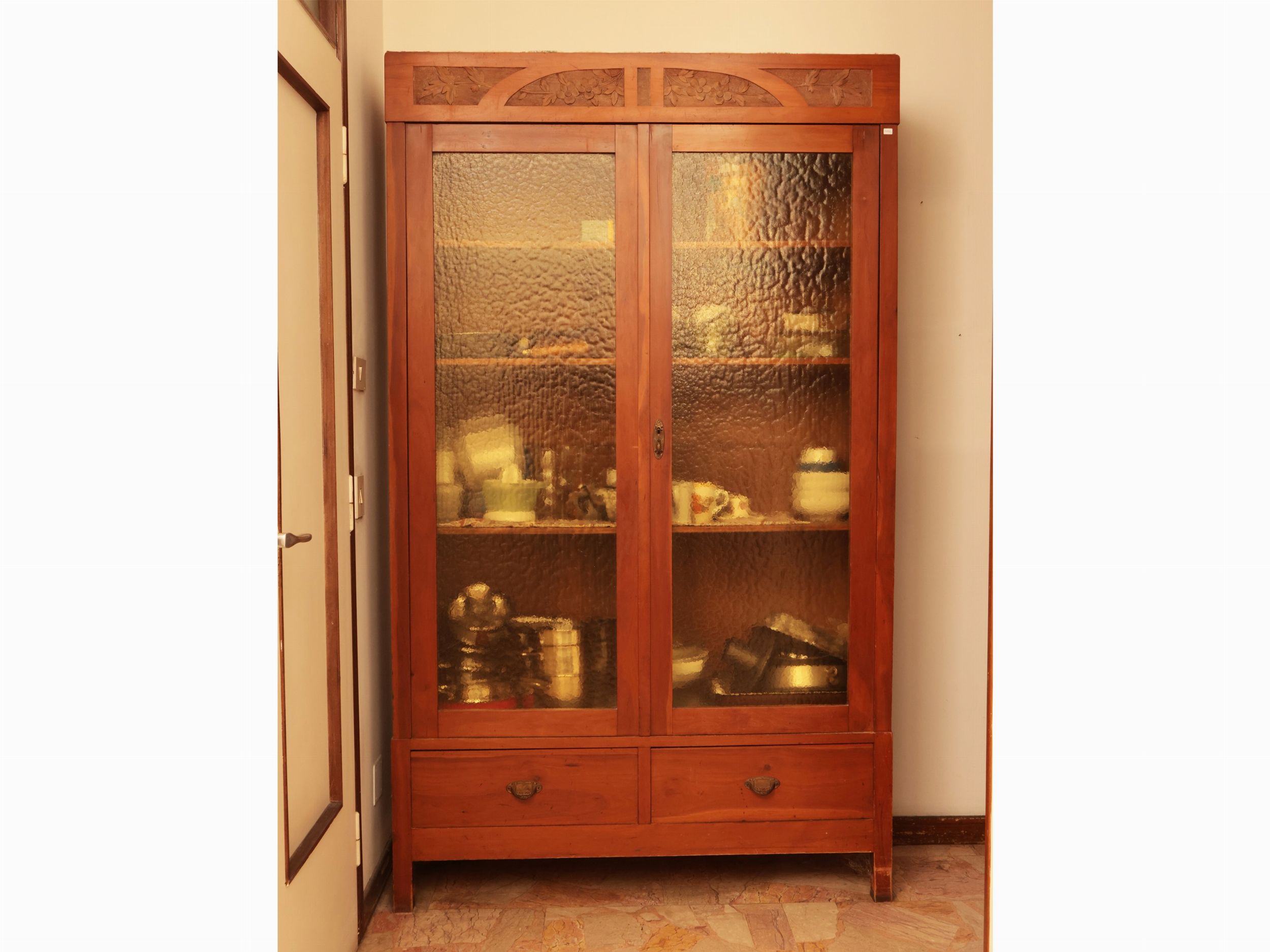 inizio del XX secolo intagliata con motivi floreali, due sportelli con vetri ambrati