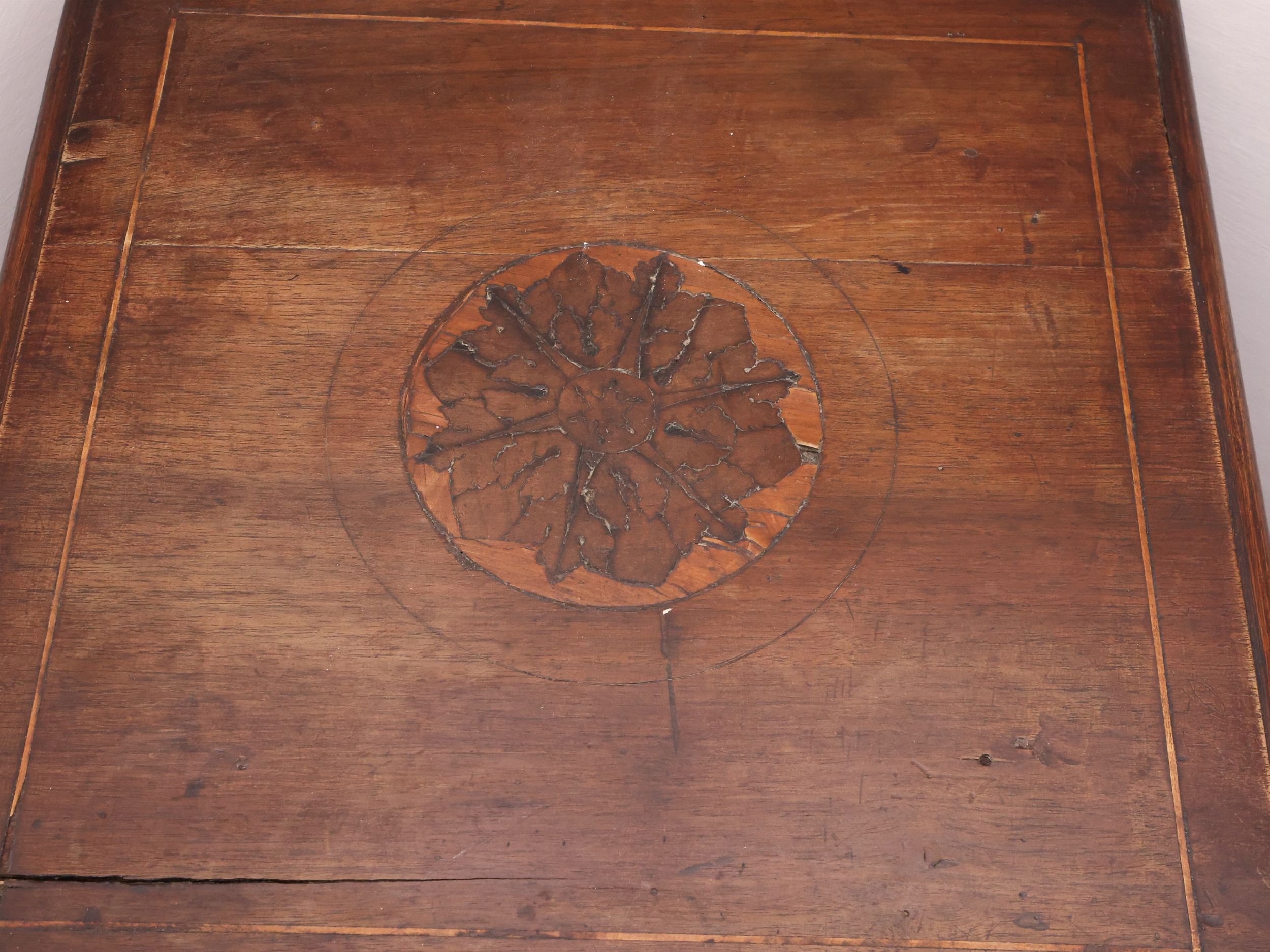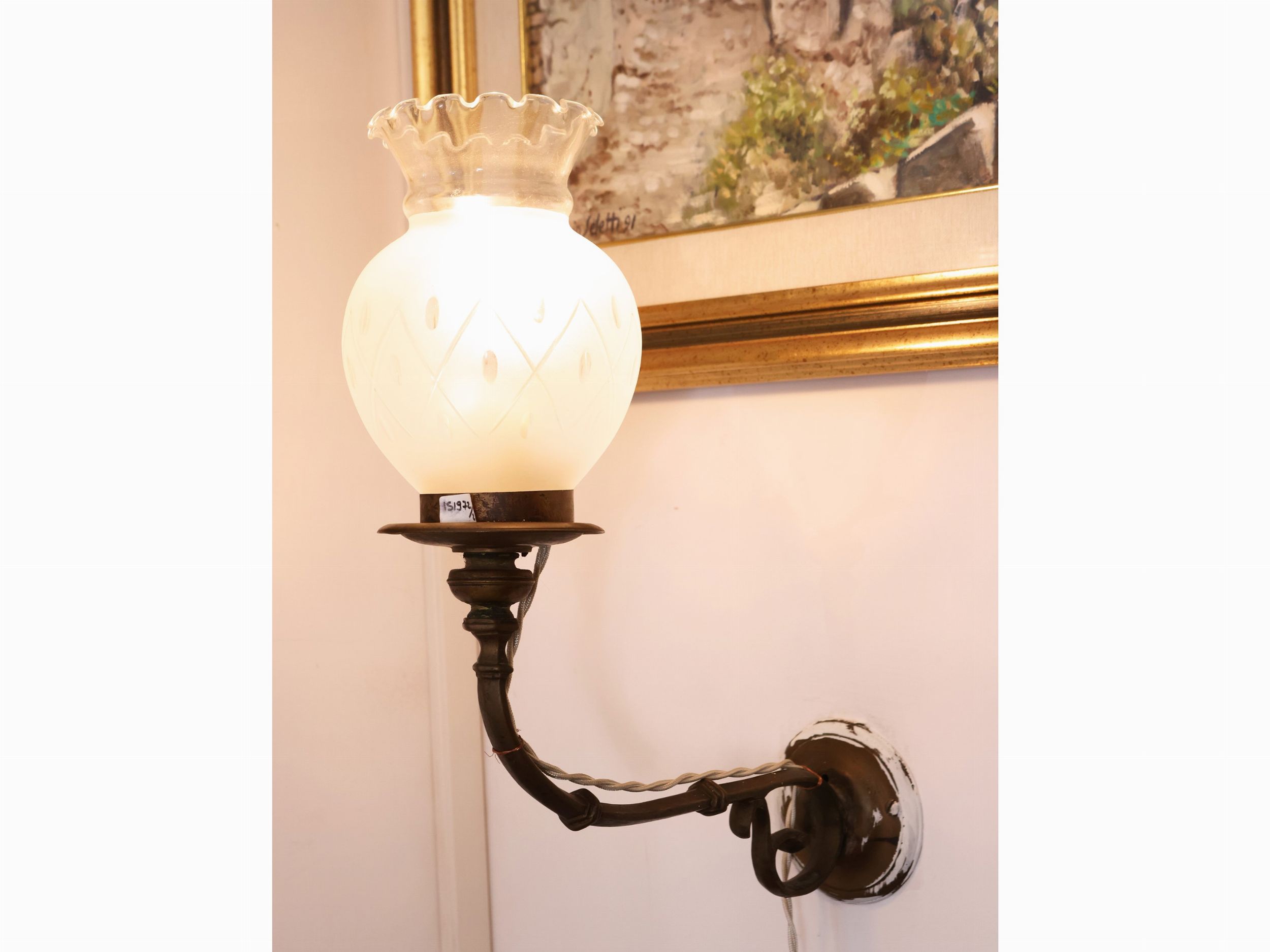 tavolino h cm 62x47x47 (2) XIX/XX secolo un tavolino in noce di gusto neorinascimentale, piano di forma quadrata intarsiato con motivo circolare geometrico e filettature, quattro sostegni tortili poggianti su alta base a plinto intagliata a rosoni, abbinato ad un'applique a muro con braccio in bronzo e bobeche in cristallo di epoca posteriore