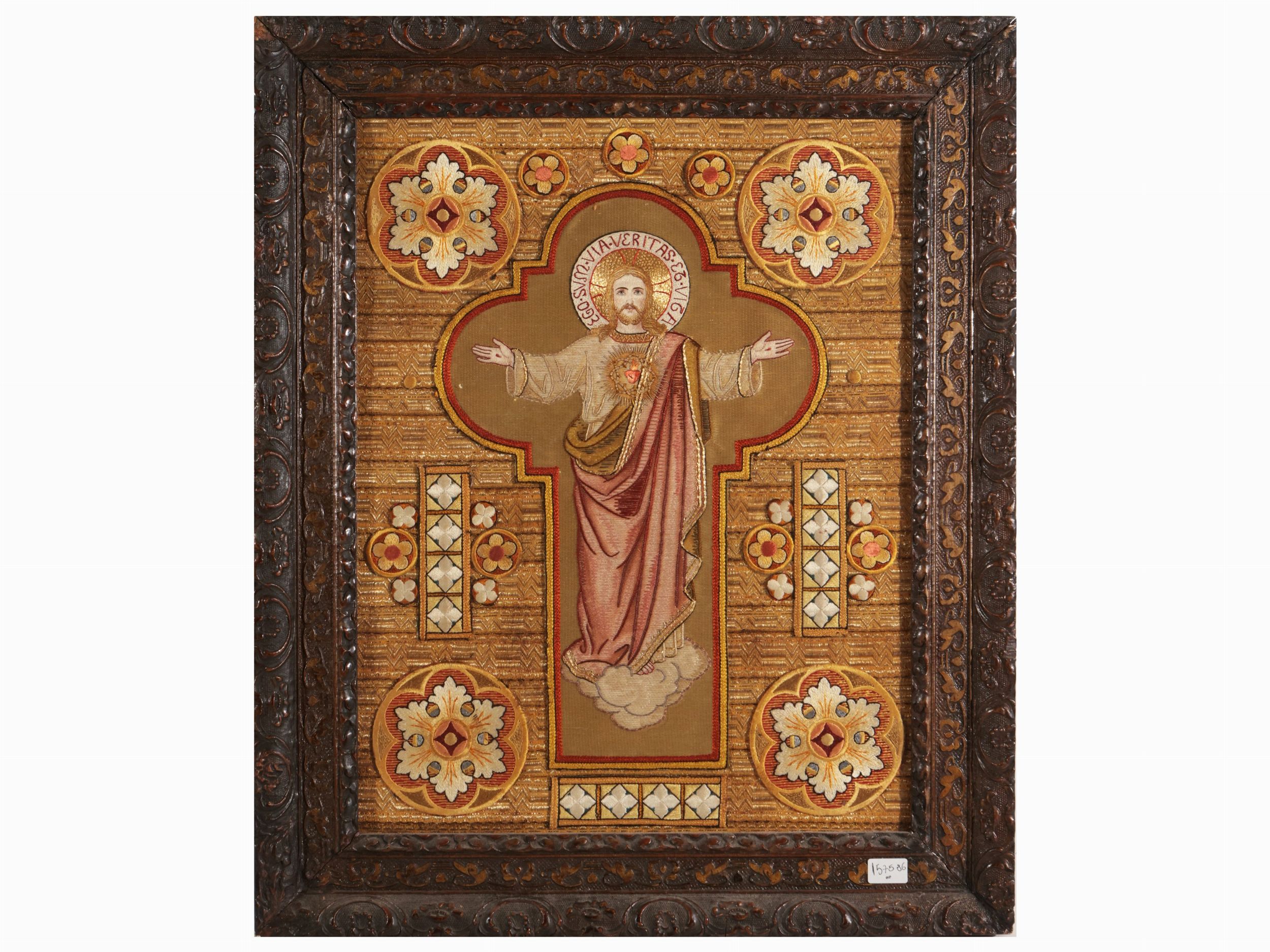inizio del XX secolo raffigurante Cristo, realizzato in seta, altri filati e frammenti di gallone dorato, in cornice