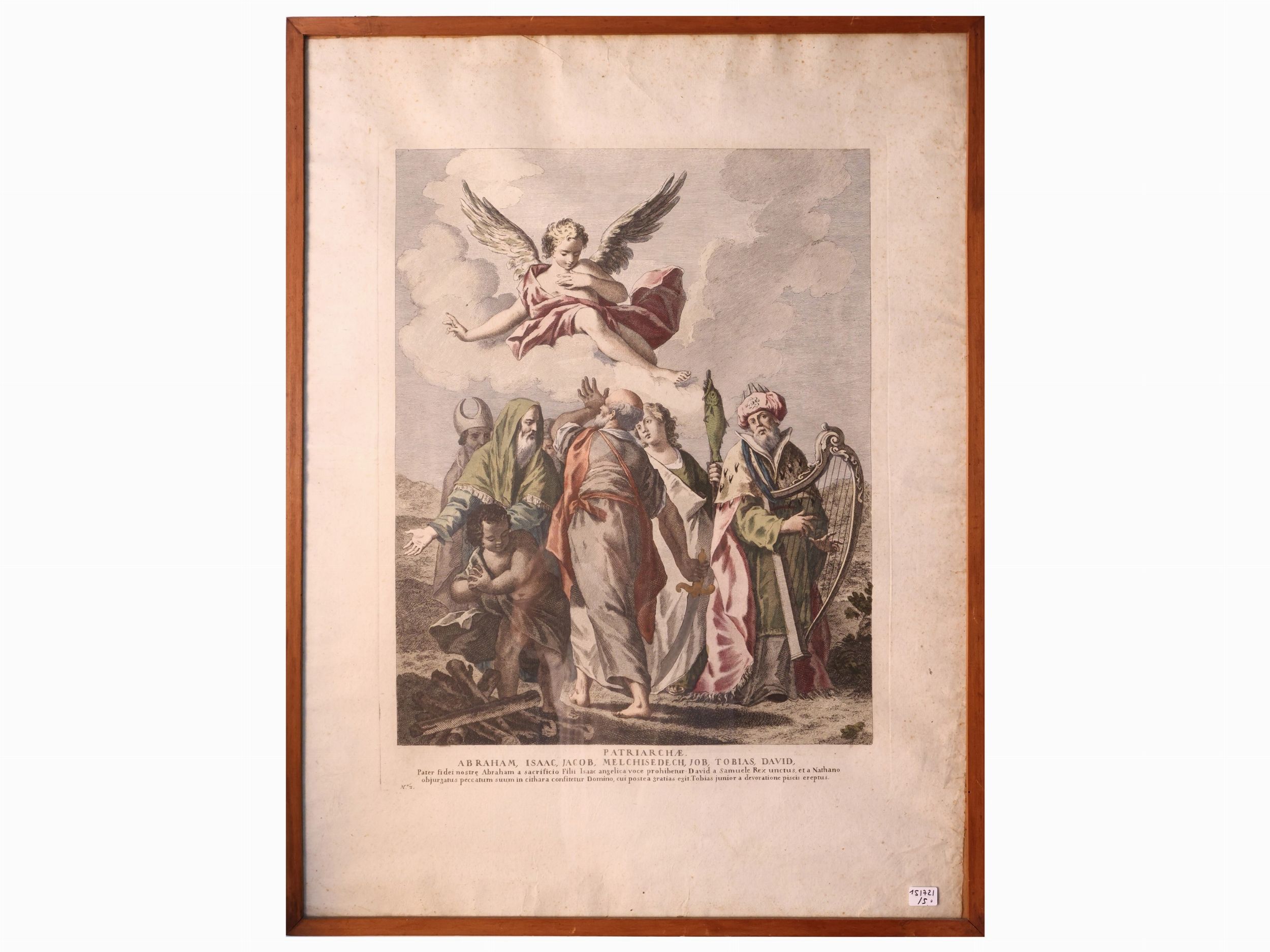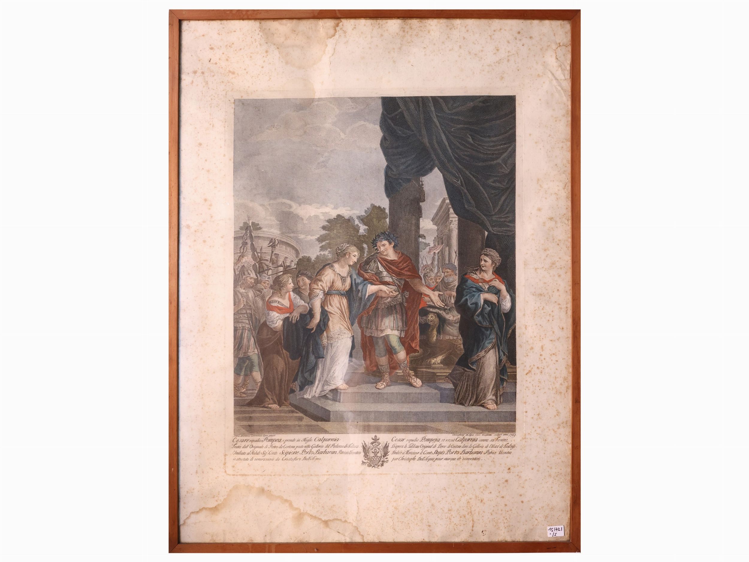 XVIII secolo cinque incisioni di cui due di Cristoforo dall'Acqua, in cornice, alcuni difetti