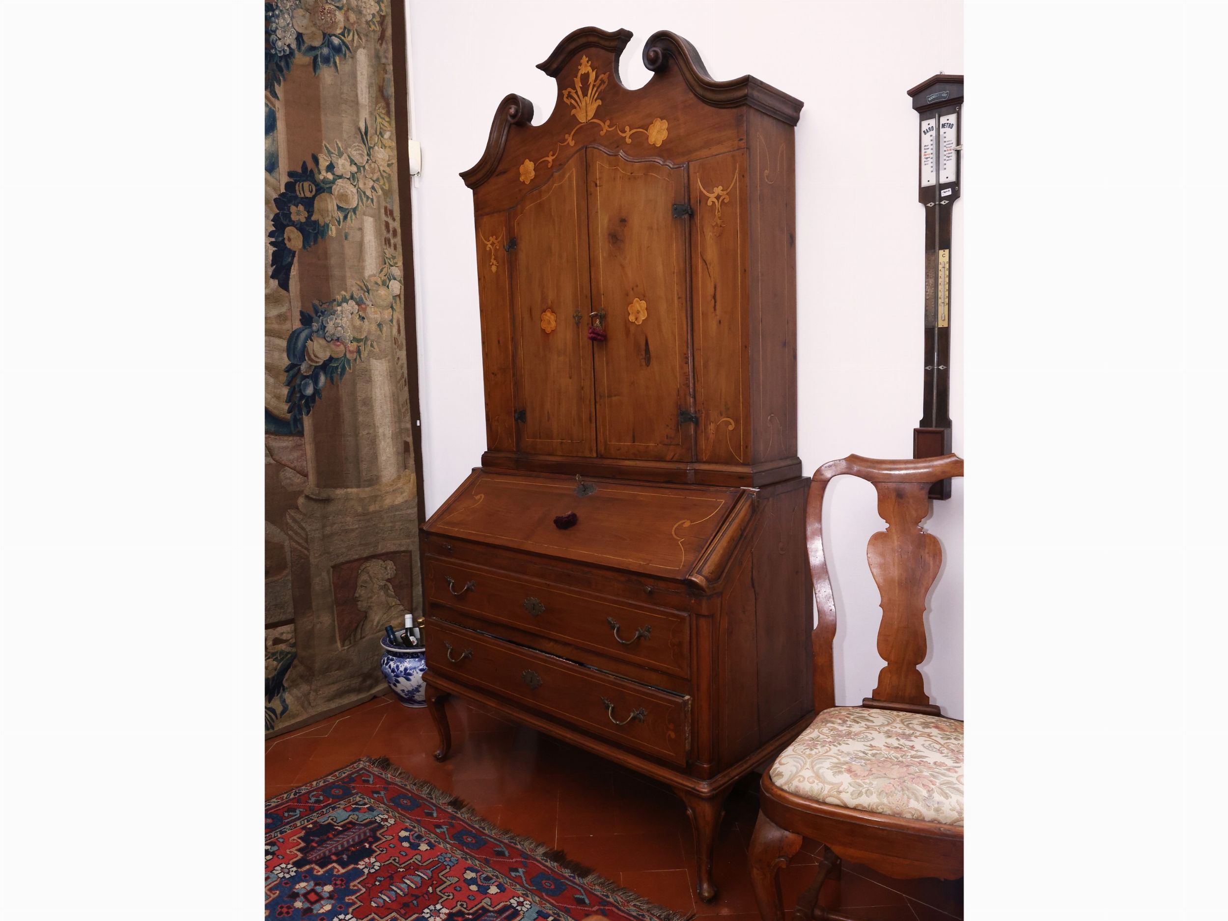 h cm 225x112x53 metà del XVIII secolo intarsiata con filettature in legni di frutto a formare volute, cappello sagomato con cimasa timpano spezzato, due sportelli, nella parte inferiore calatoio a celare scarabattolo con due cassettini e vano, due cassetti sul fronte dritto, piedi mossi desinenti a ricciolo