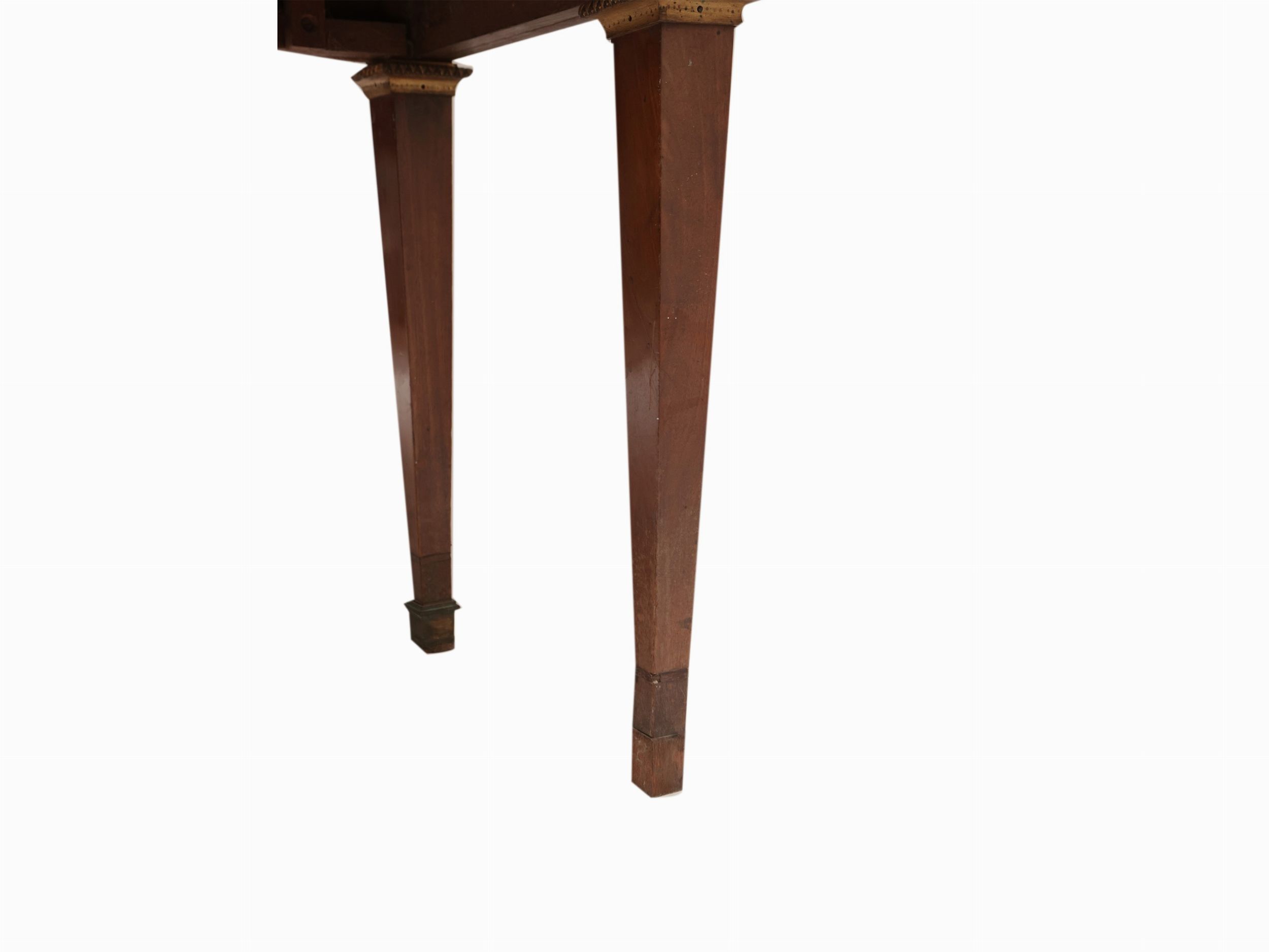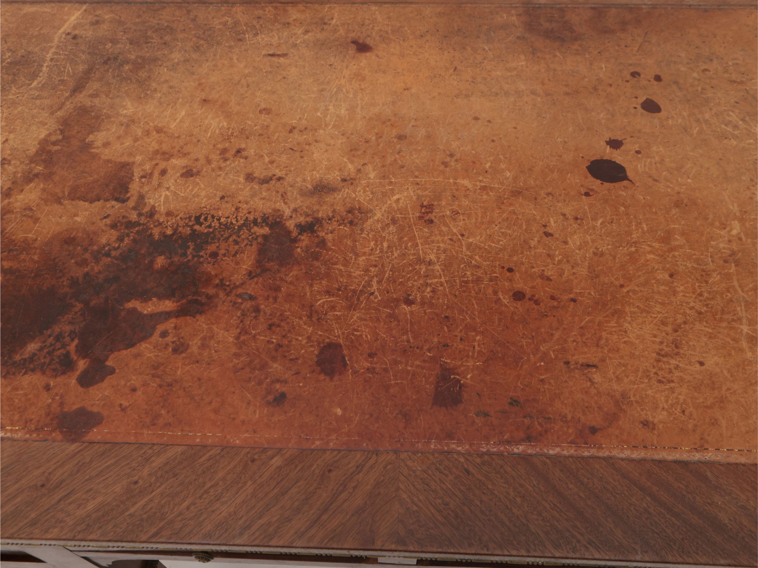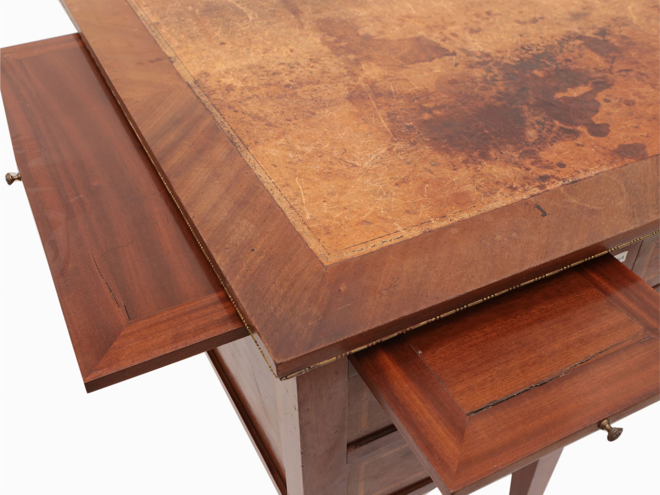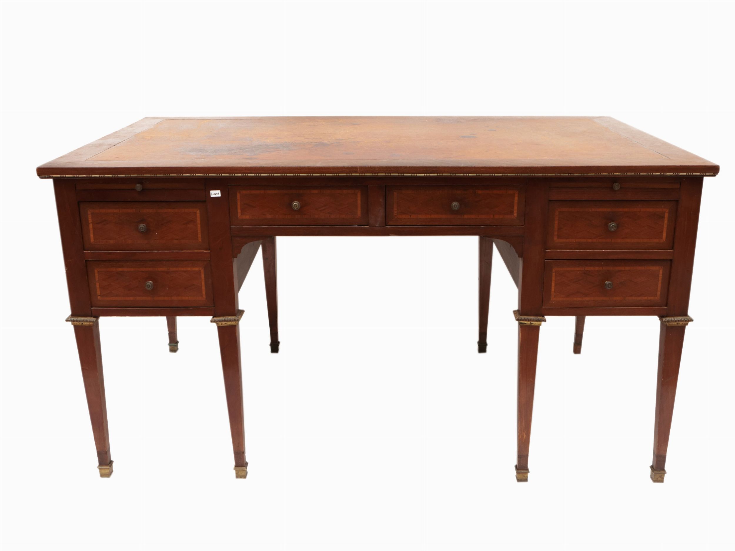 Francia, XX secolo intarsiata con filettature a formare motivi romboidali, sei cassetti a ponte e due tiretti ai lati sotto il piano ed altri due sul fronte, dettagli in bronzo dorato, gambe a faretra, lievi difetti