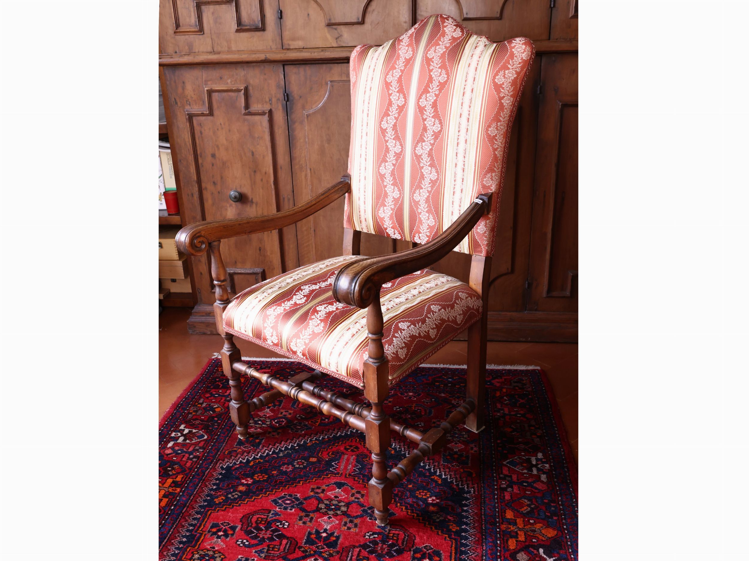 realizzato in stile seicentesco, ampi braccioli a giorno a voluta, gambe anteriori e traverse tornite, rivestito in tessuto nei toni del rosa antico