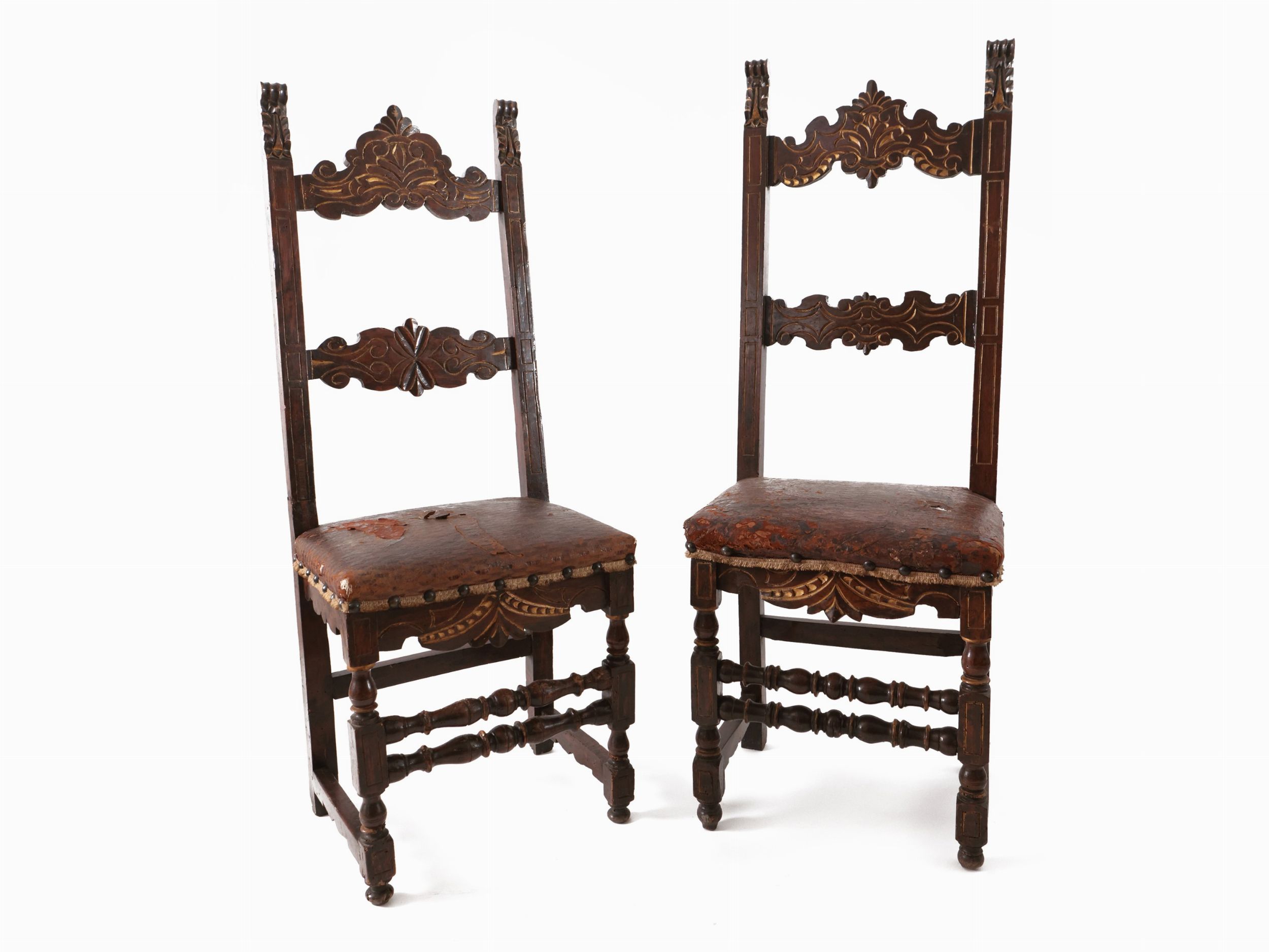 XVII secolo schienali con doppia cartella intagliata e dorata con motivo a volute, sedili imbottiti e rivestiti in pelle decorata da borchie in ferro, gambe tornite, alcuni difetti
