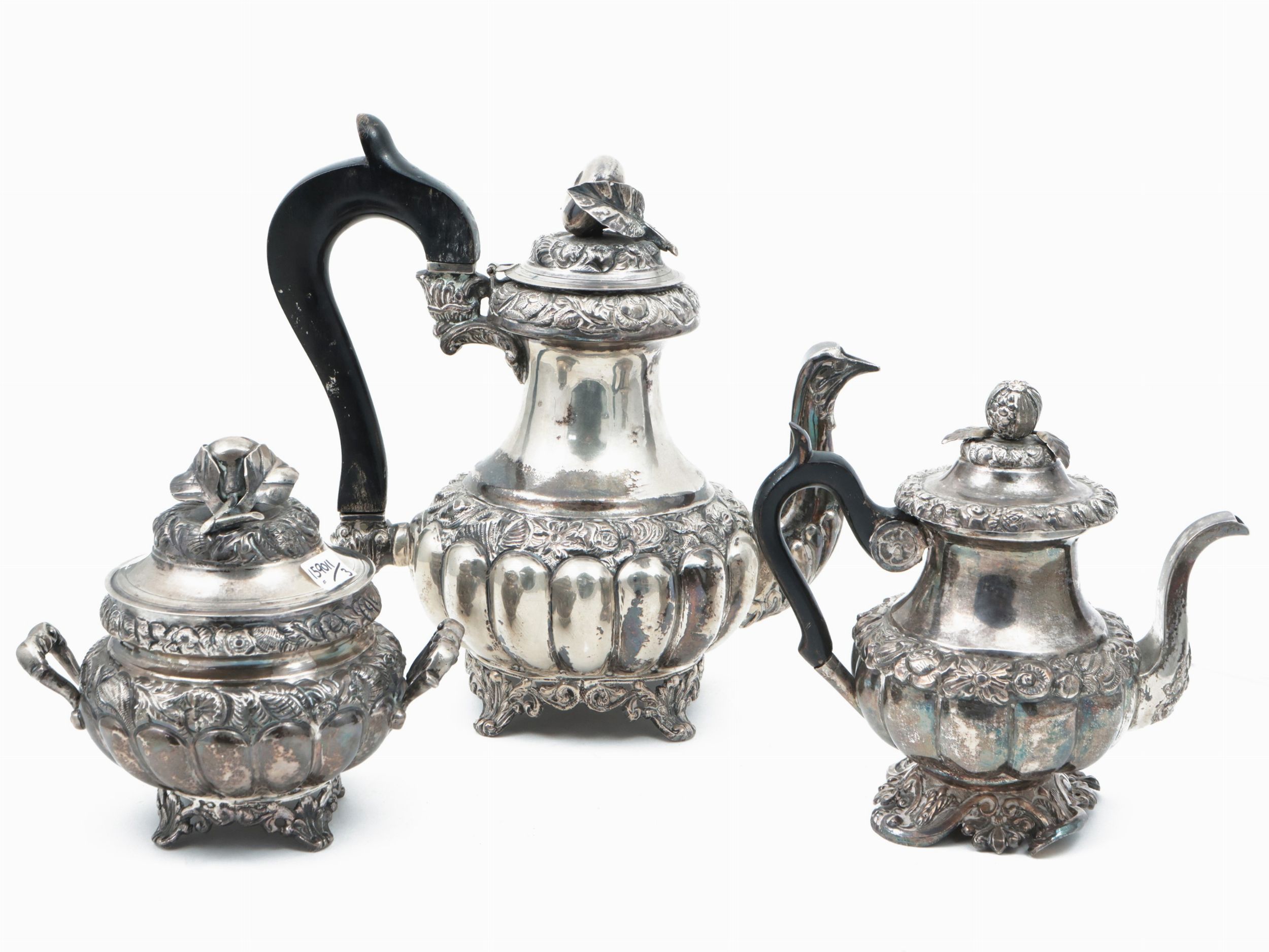 gr 1930, h da cm 15 a cm 24,5 (3) composto da due caffettiere a scalare e zuccheriera, corpo baccellato con bordi sbalzati con ghirlande di fiori e conchiglie, piedini traforati con volute, prese dei coperchi a foggia di frutti, dettagli in legno ebanizzato, lievi difetti
