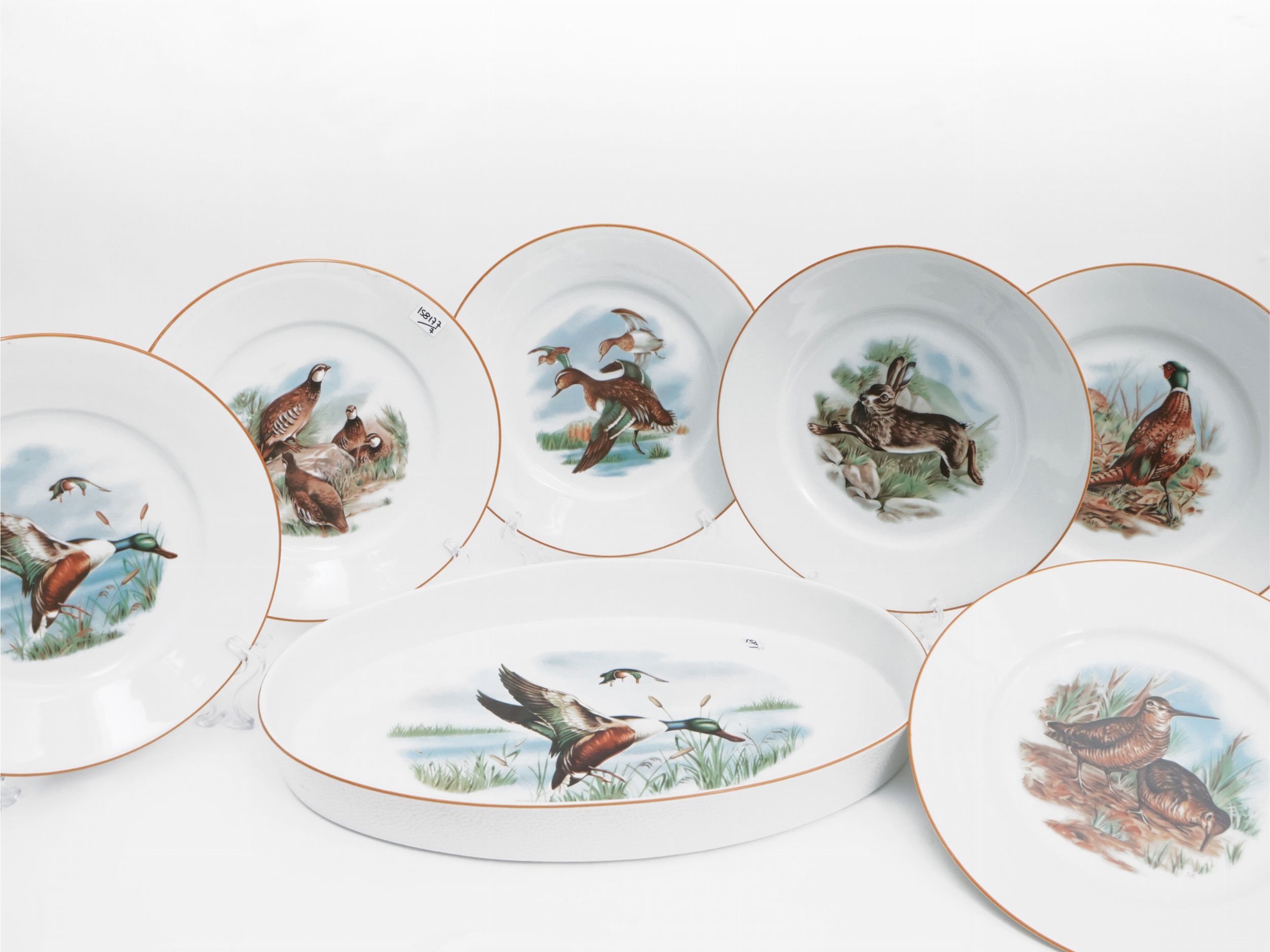 Anni Ottanta decorato con volatili e prede da caccia e bordo nei toni dell'arancio, composto da otto piatti piani ed un vassoio di forma ovale, lievi difetti