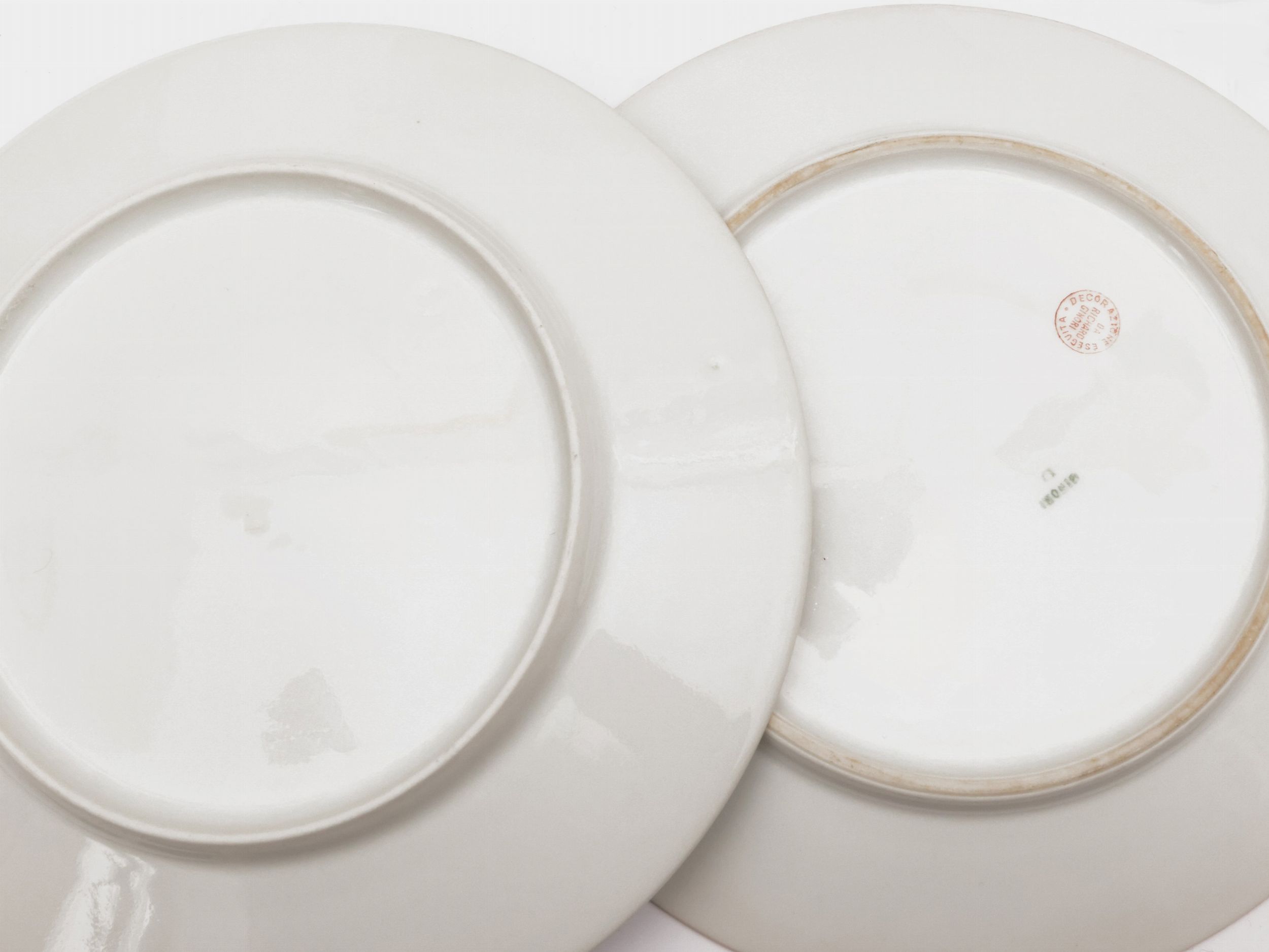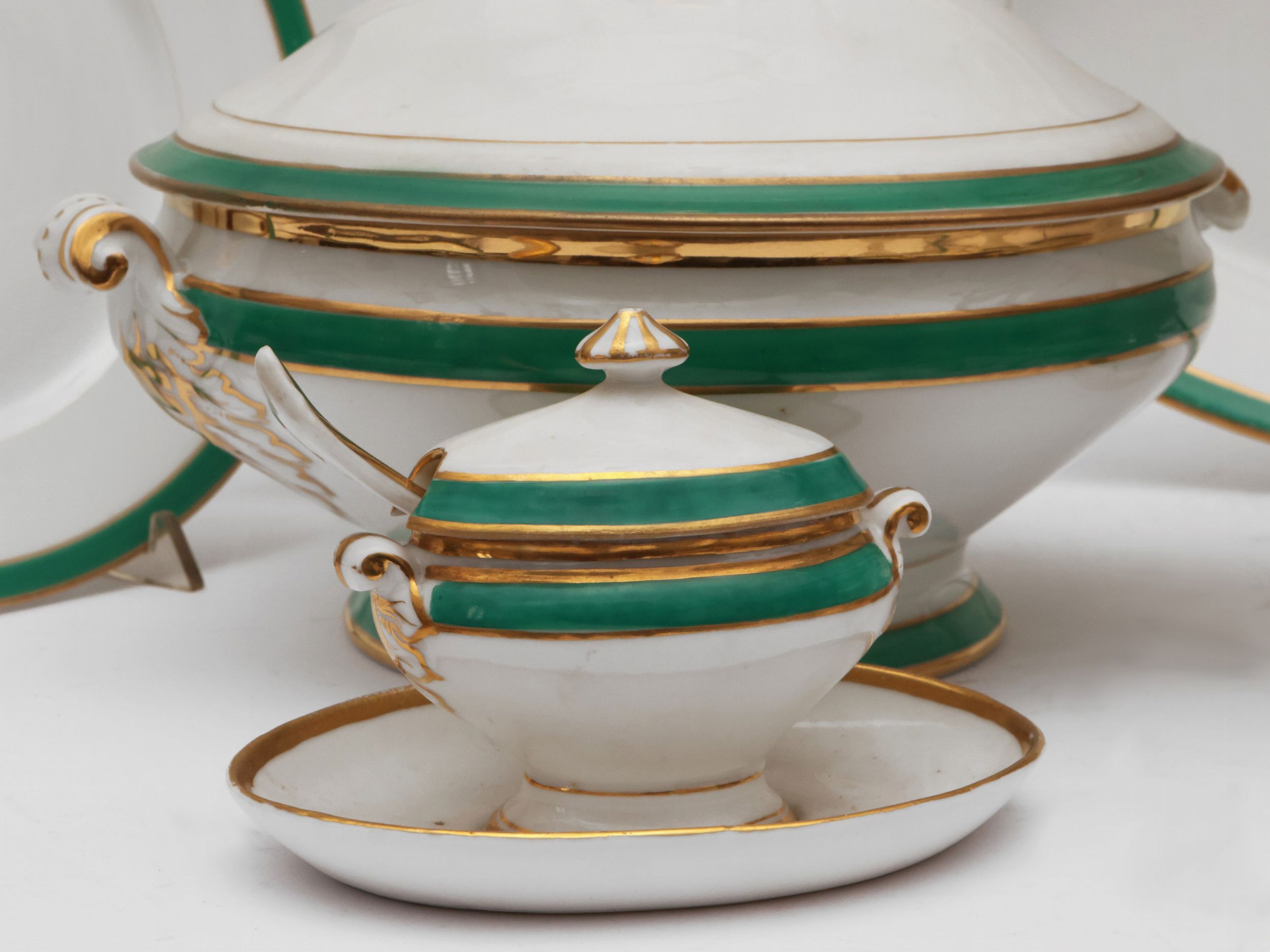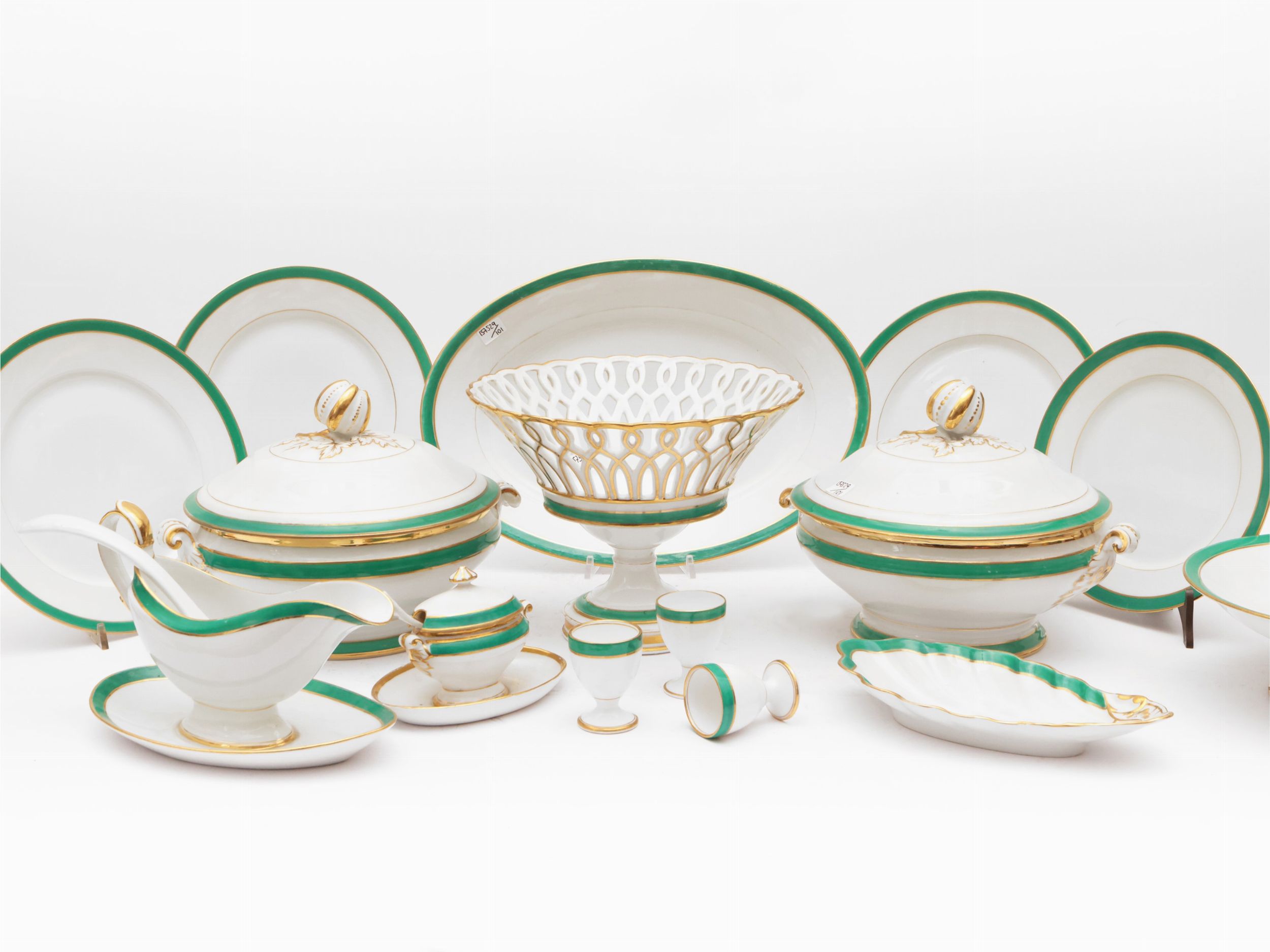 seconda metà del XIX secolo bordo verde lumeggiato in oro, composto da 11 piatti fondi, 47 piatti piani, 16 piattini da antipasto e 4 da dolce, due zuppiere ed un'altra (senza coperchio e con un restauro), una fruttiera centrotavola con bordo traforato, un vassoio di forma ovale ed uno circolare, due alzate, due salsiere con cucchiaio, due antipastiere a foggia di conchiglia ed 11 portauovo, lievi difetti