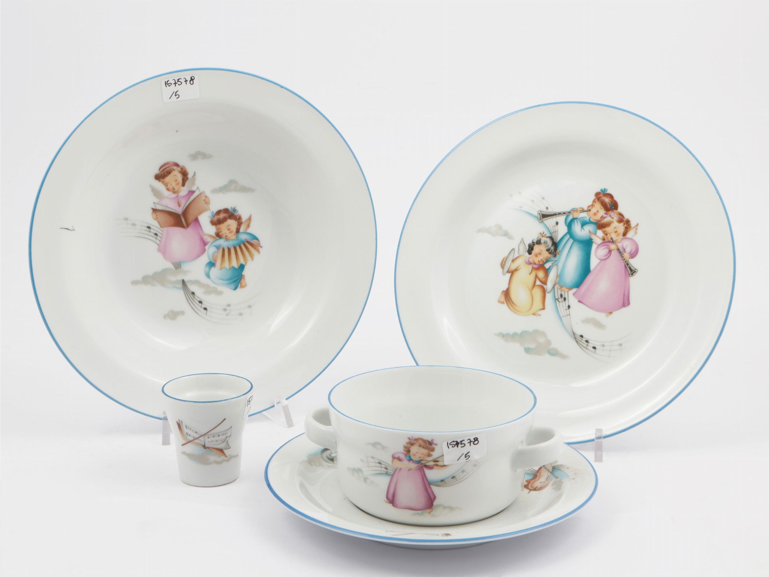 decorato con figure di angeli, composto da un piatto fondo e uno piano, una tazza con piattino e un bicchierino per uovo alla coque