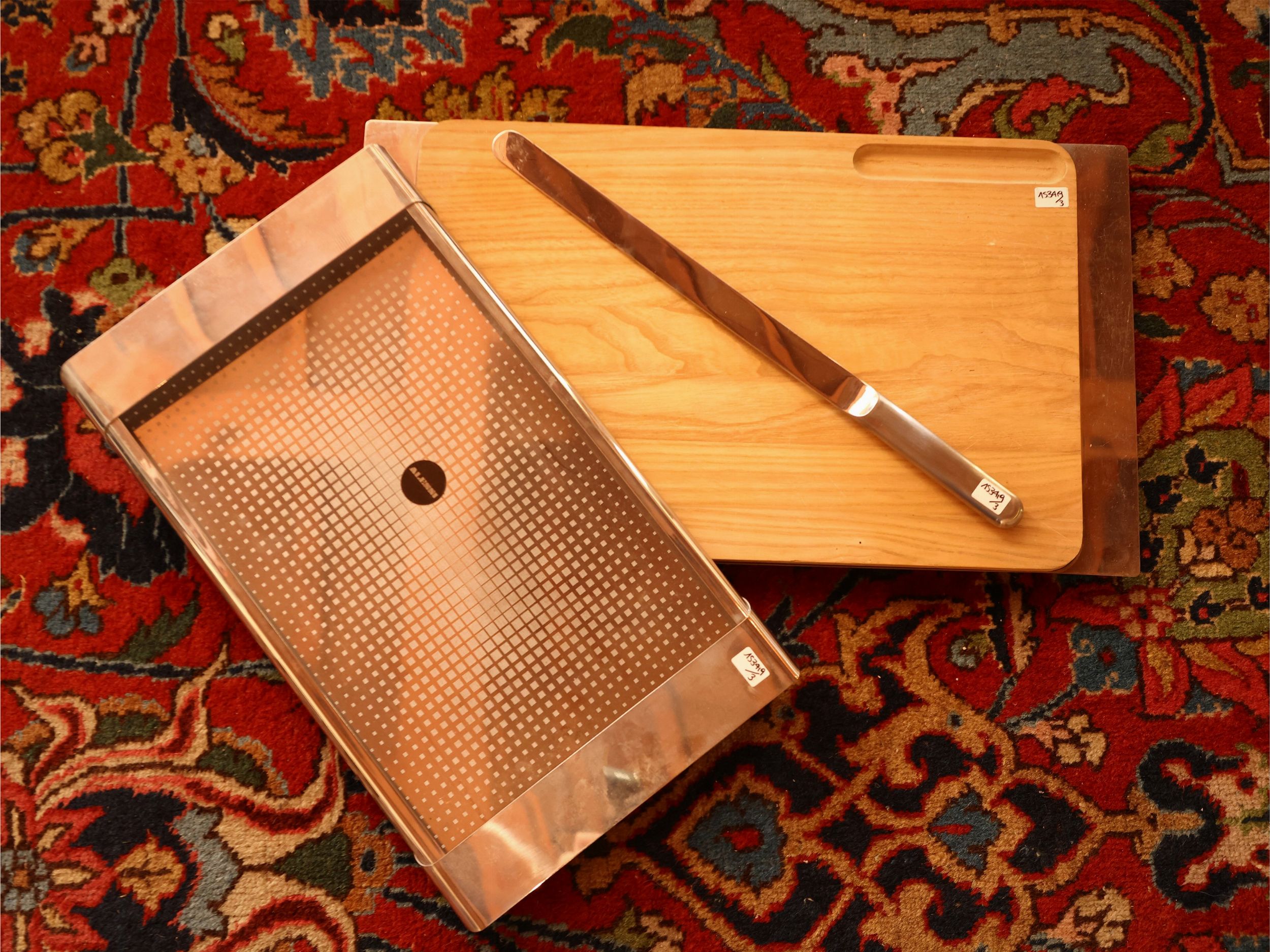 Italia, Anni Settanta un taglierei per formaggi in legno e acciaio ed un vassoio Tiffany di Silvio Coppola