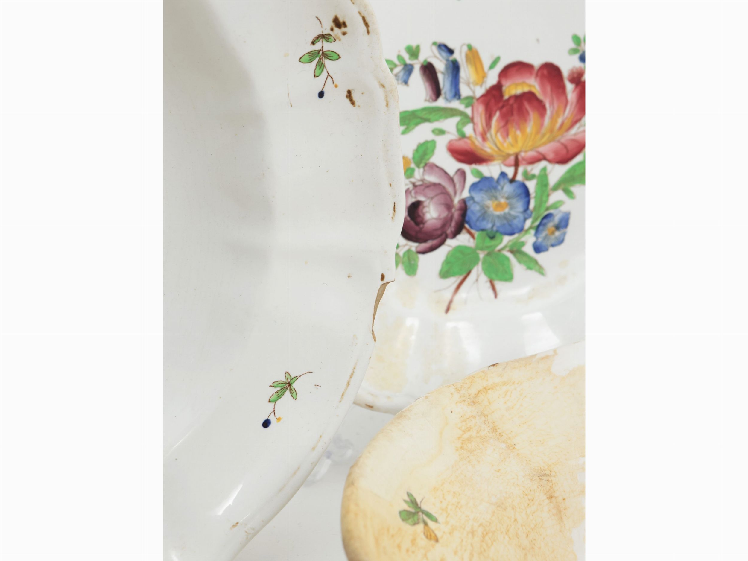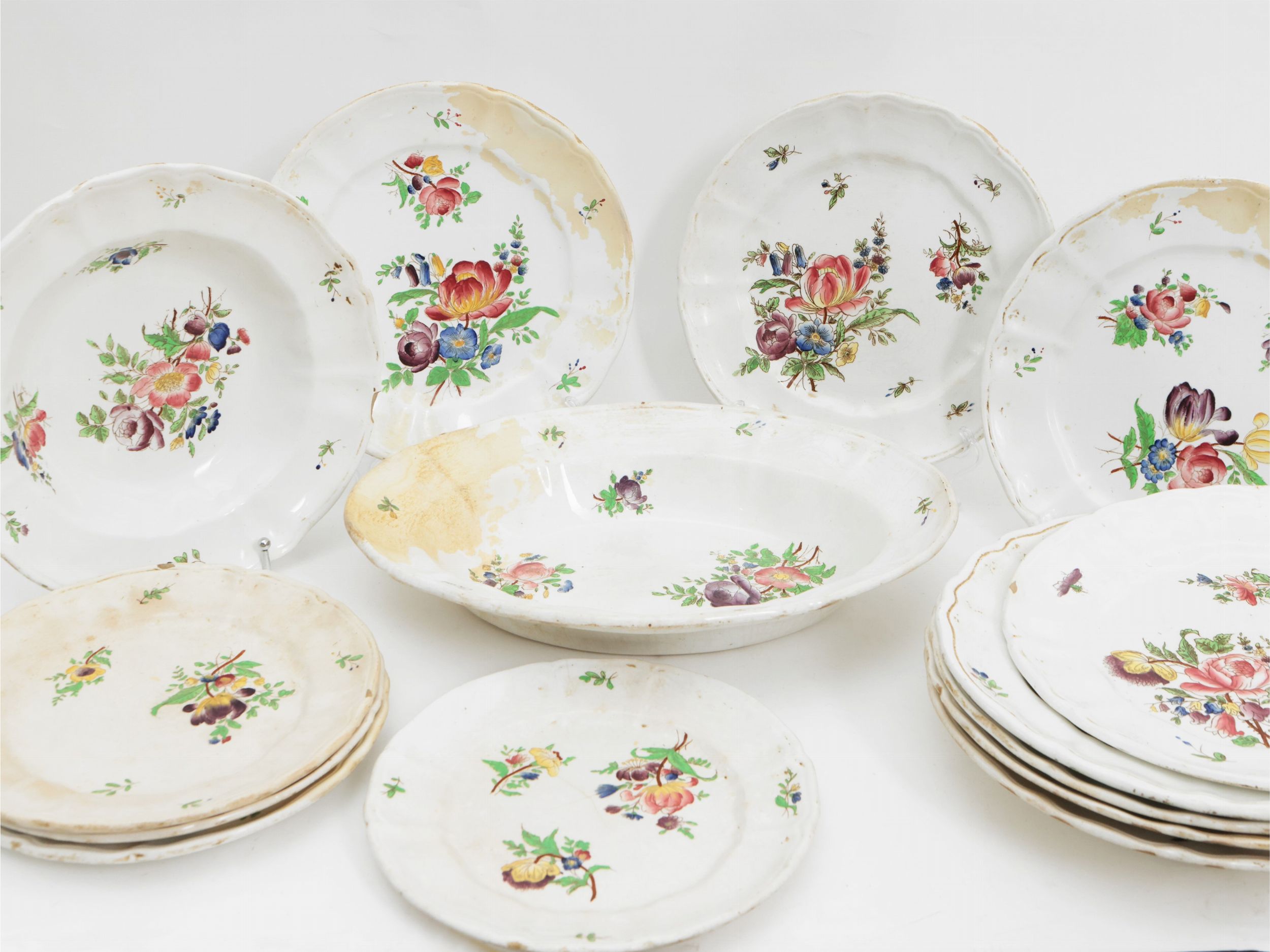 cm 26x35 (21) seconda metà del XIX secolo dipinto in policromia con motivo floreale, completo per sei persone, composto da 6 piatti fondi, 8 piatti piani, 6 piattini ed un vassoio di forma ovale, alcuni difetti e restauri