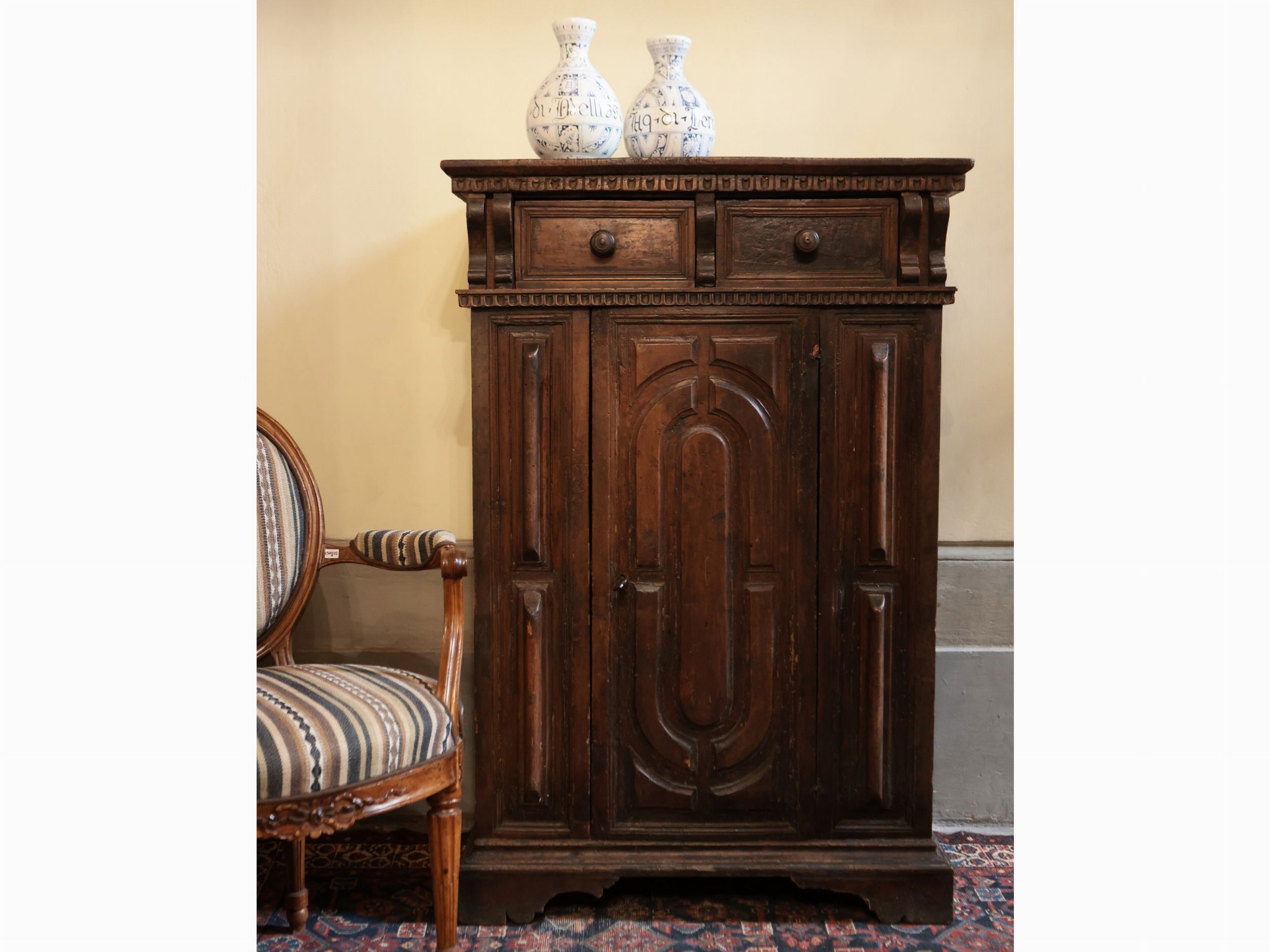 XVIII secolo cappello aggettante con gocciolatoio e due cassettini sottostanti, uno sportello intagliato con cornici sul fronte tra lesene piatte, piedi a mensola, alcuni difetti