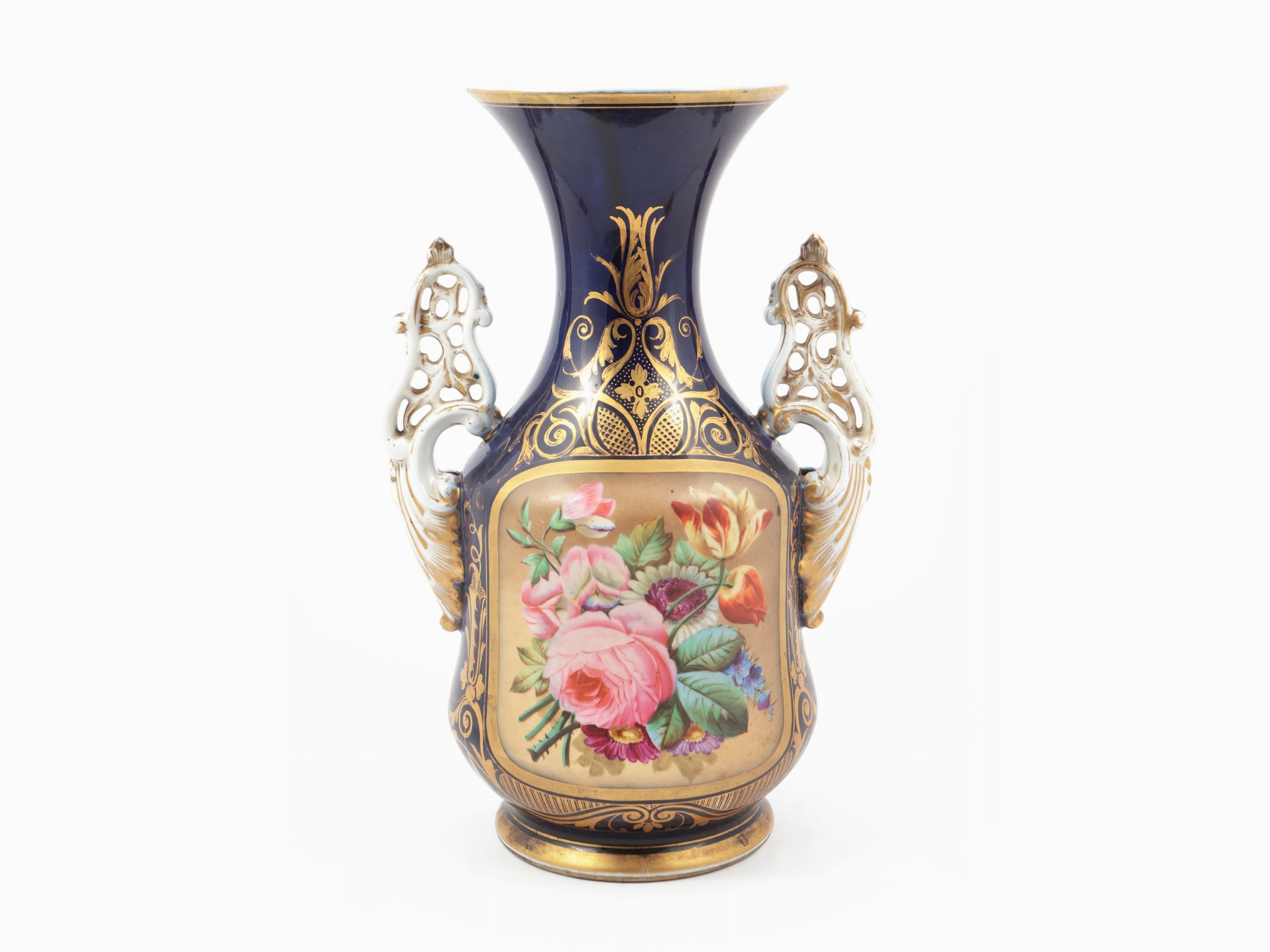 Francia, metà del XIX secolo dipinto con motivo floreale policromo entro riserva dorata su fondo blu, anse traforate, lievi difetti