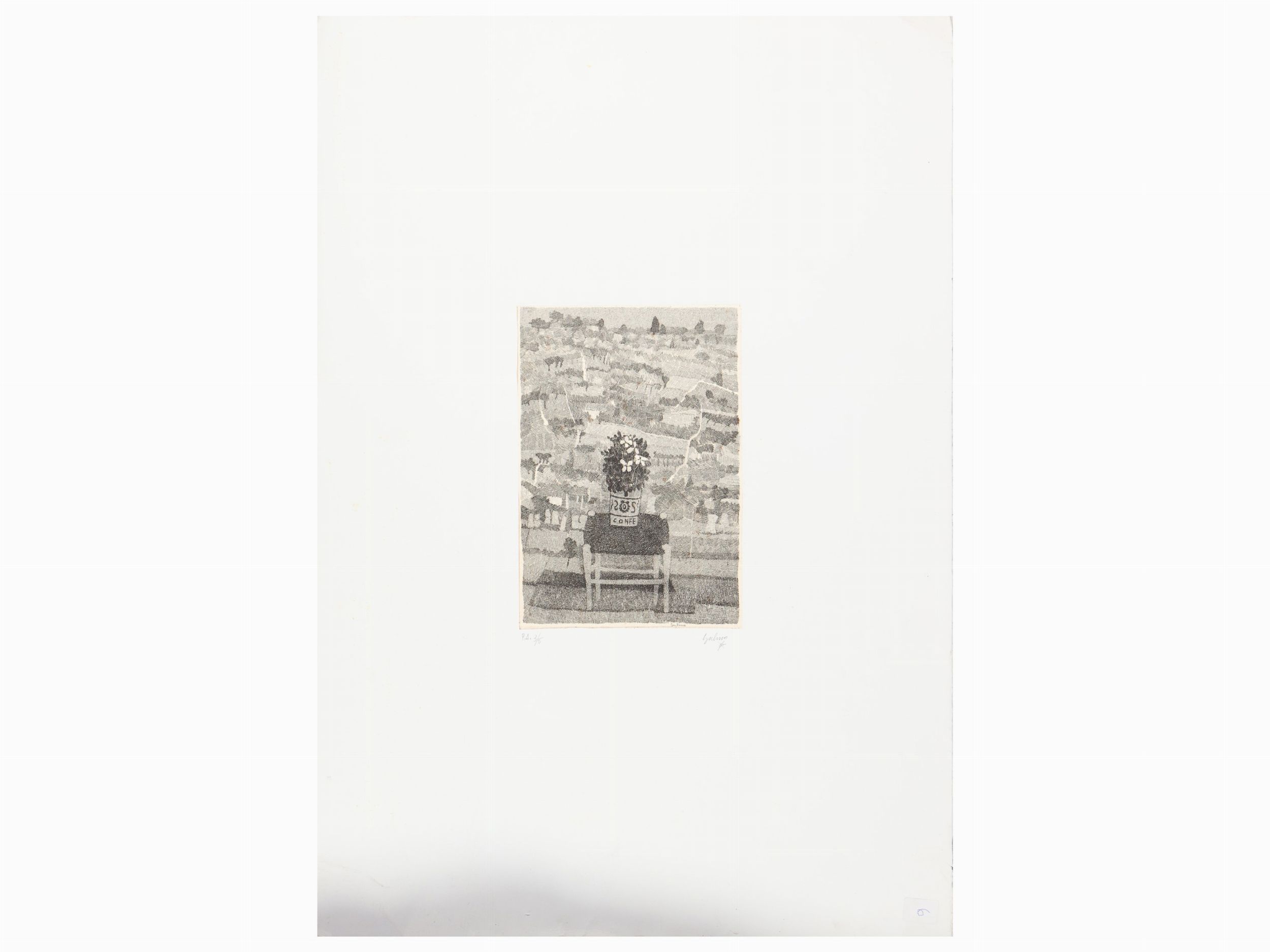 Vaso di fiori in fronte a paesaggio marchigiano