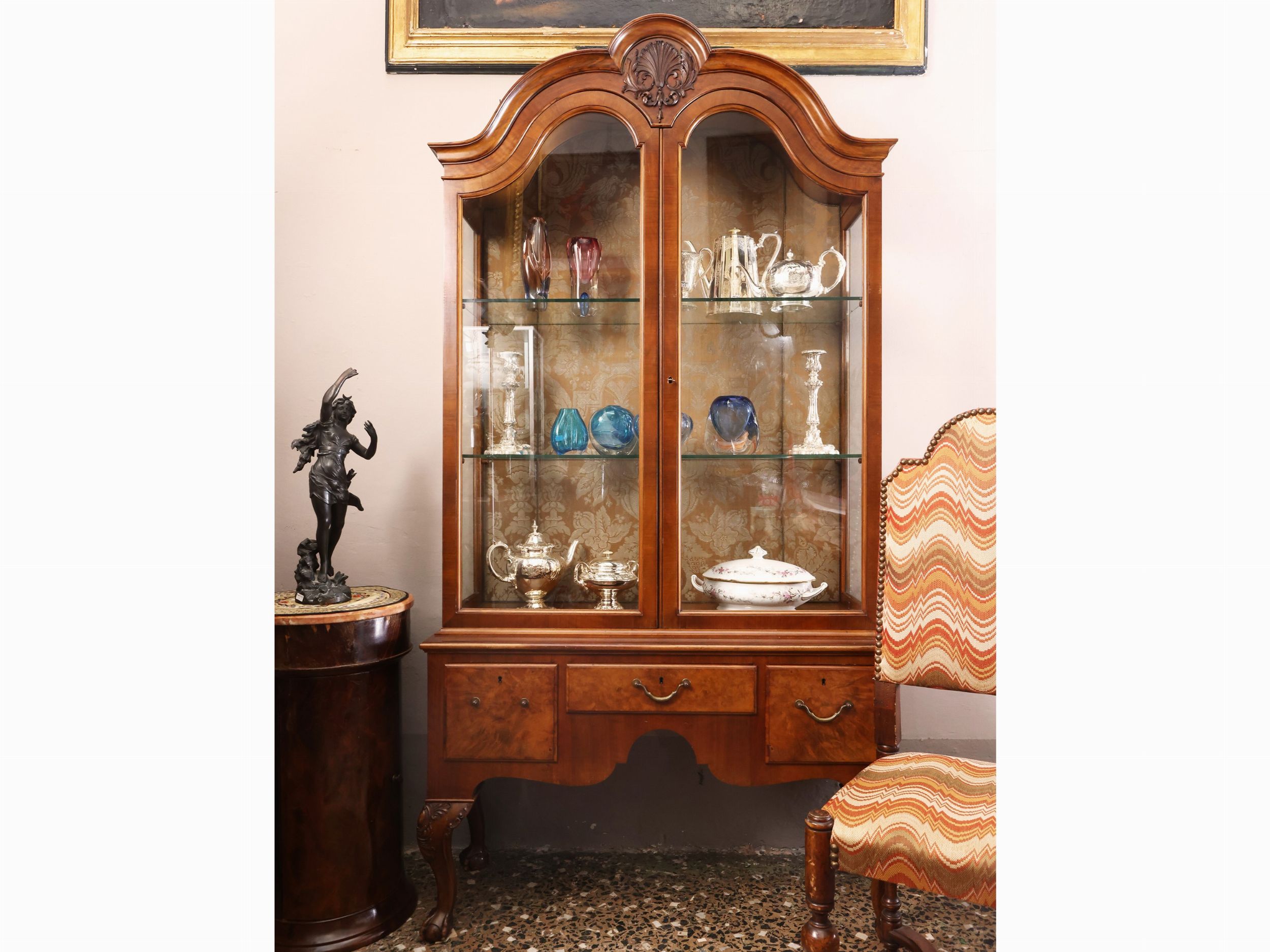 h cm 207x106x42 Inghilterra, prima metà del XX secolo cappello centinato con cimasa centrata da conchiglia, due sportelli a vetro con tre mezzi cassetti sottostanti, pendaglina sagomata, gambe mosse con piedi a sfera artigliata, all'interno due ripiani in vetro con altezza regolabile e fondo rivestito in damasco color oro