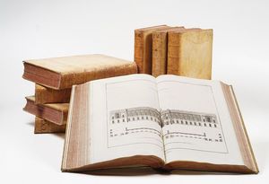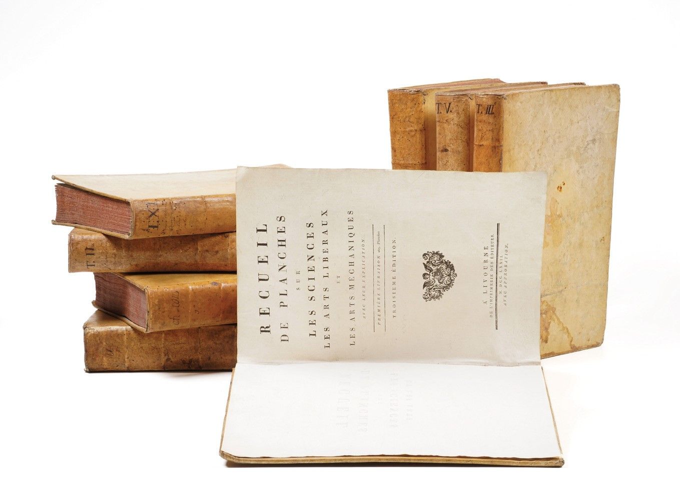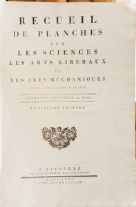 In-folio. Rilegature coeve parzialmente uniformi in piena pergamena rigida. 17 volumi di testo e 11 volumi di tavole. Il volume 17 del testo presenta un danno all'angolo inferiore esterno che riguarda buona parte del tomo con la perdita di pochissime lettere di testo limitatamente alle prime 90 pagine. Si tratta di un difetto imputabile al lavoro di un roditore. Per altro, si tratta di una copia molto bella, con le tavole in buona tiratura. Mancano, come talvolta accade, i 4 volumi di supplementi. Bell'esemplare genuino di questa rara edizione di Livorno.