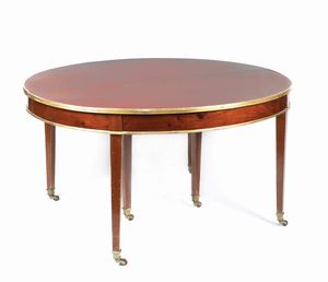 75x141x117 cm. Francia, XVIII-XIX Sec. piano ovale profilato in bronzo dorato e poggiante su sei gambe troncopiramidali [..]