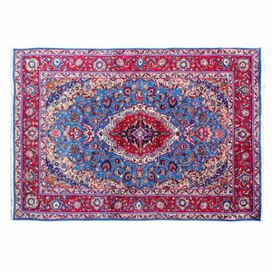 300x207 cm. XX Sec. disegno floreale e vegetale su fondo celeste e rosso, lievi usure