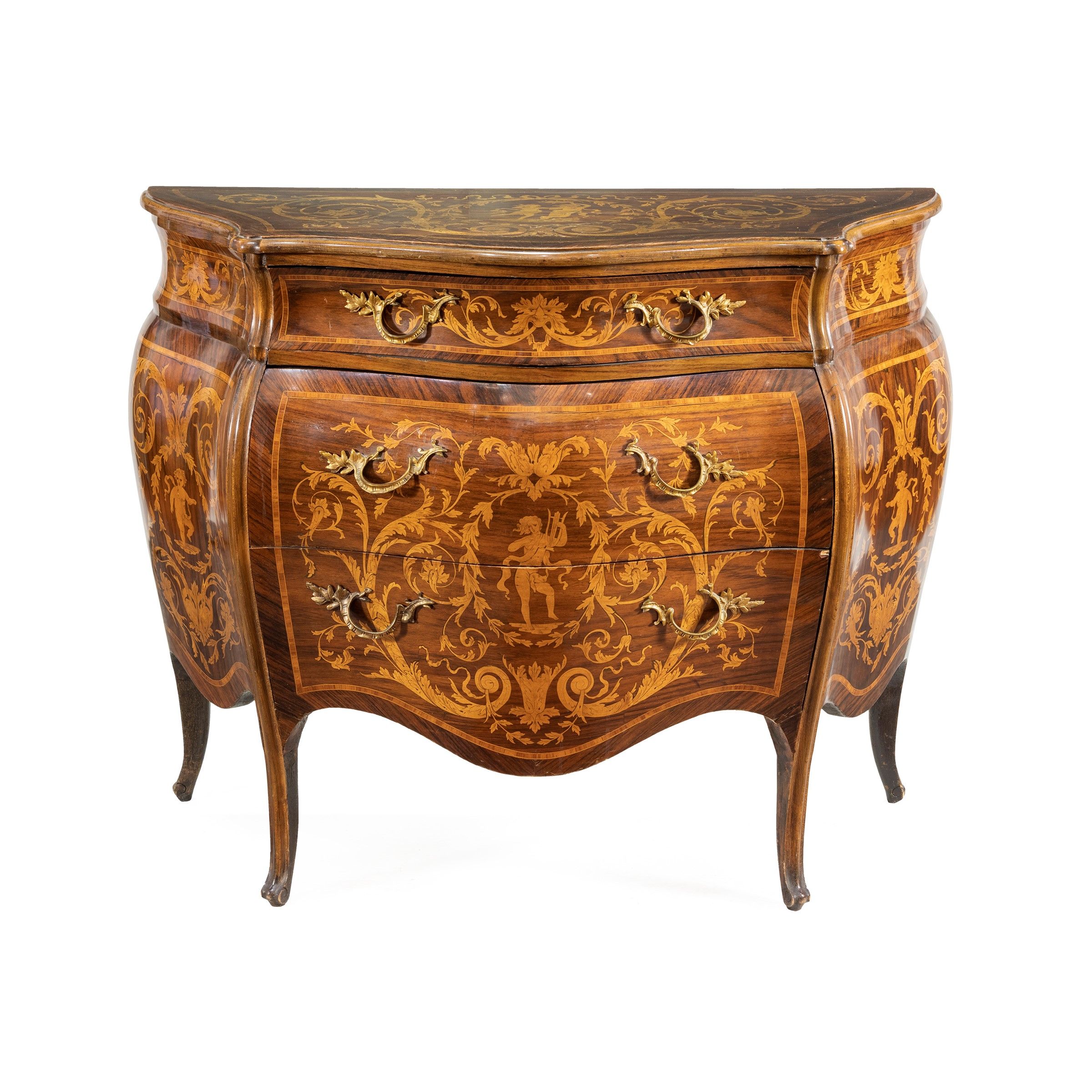 Italia, XX Sec. interamente intarsiata con motivi di volute e figure mitologiche, fronte bombato a tre cassetti, piano sagomato