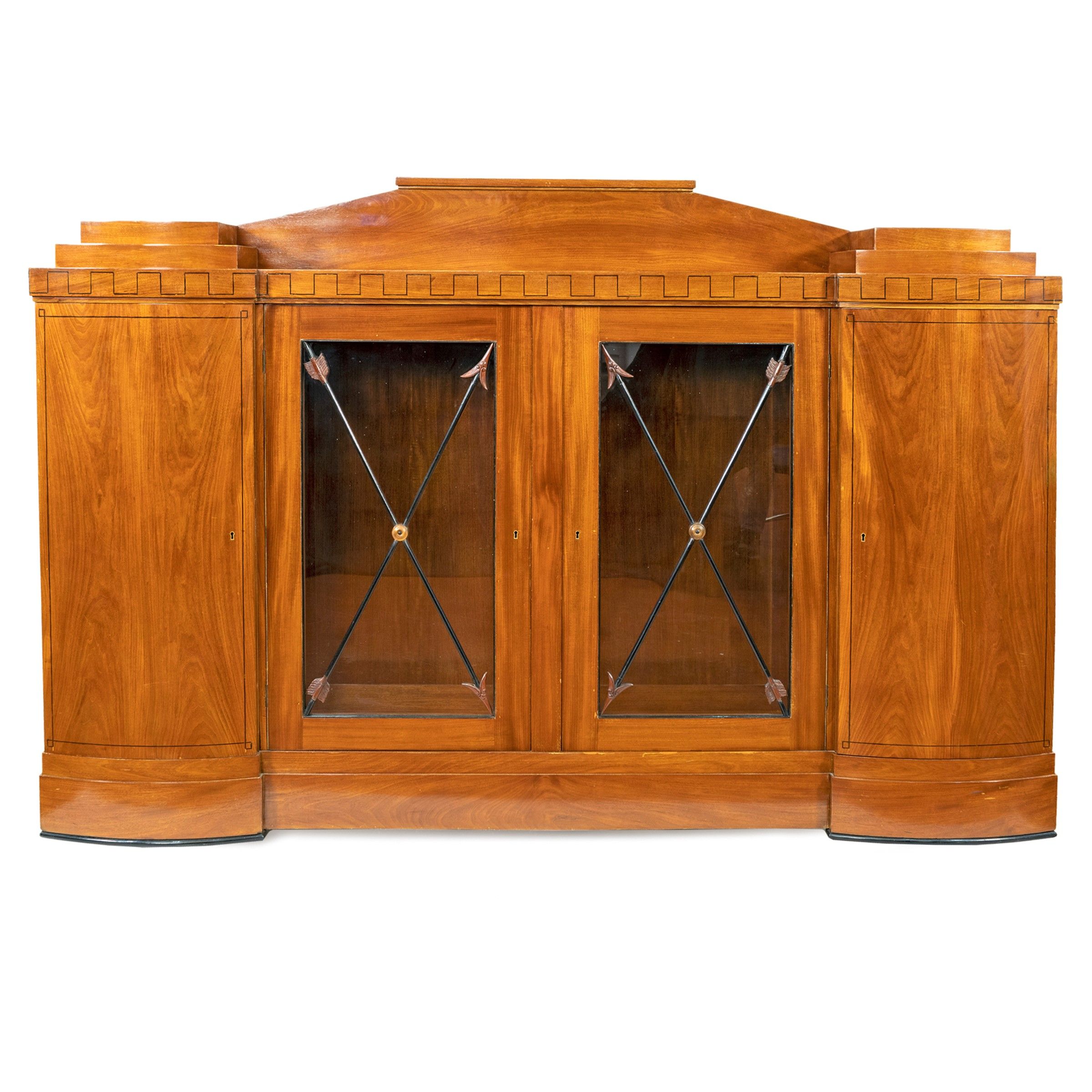 Nord Europa, inizio XX Sec. fronte bombato con sportelli di cui due centrali a vetrina, decorati con motivi di frecce in legno ebanizzato, parte superiore con tre piani scalari e fascia intarsiata a motivo di greca