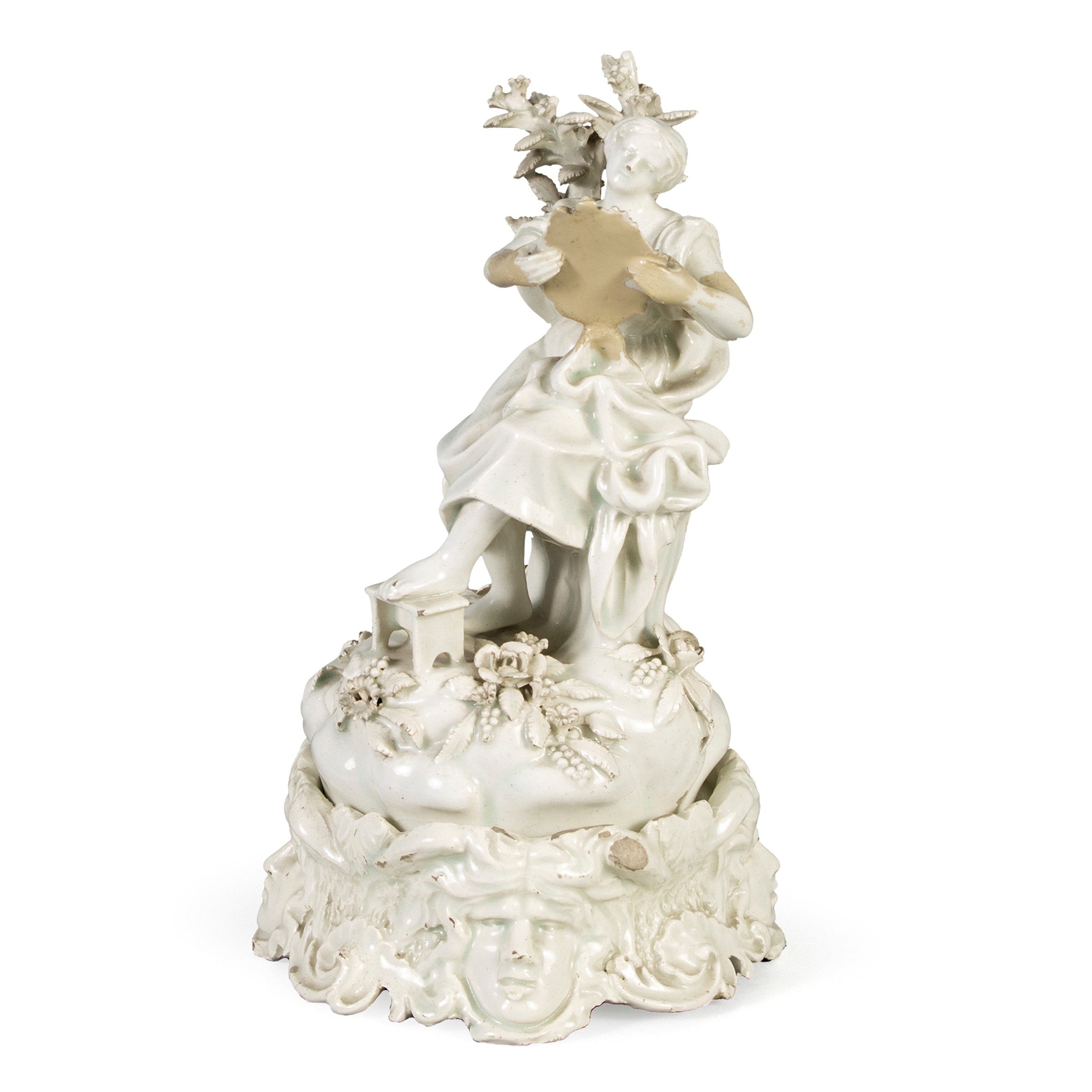 Nove di Bassano, XVIII-XIX Sec. raffigurante allegoria della bellezza, poggiante su base a roccailles decorata con mascheroni e volute, difetti e restauri