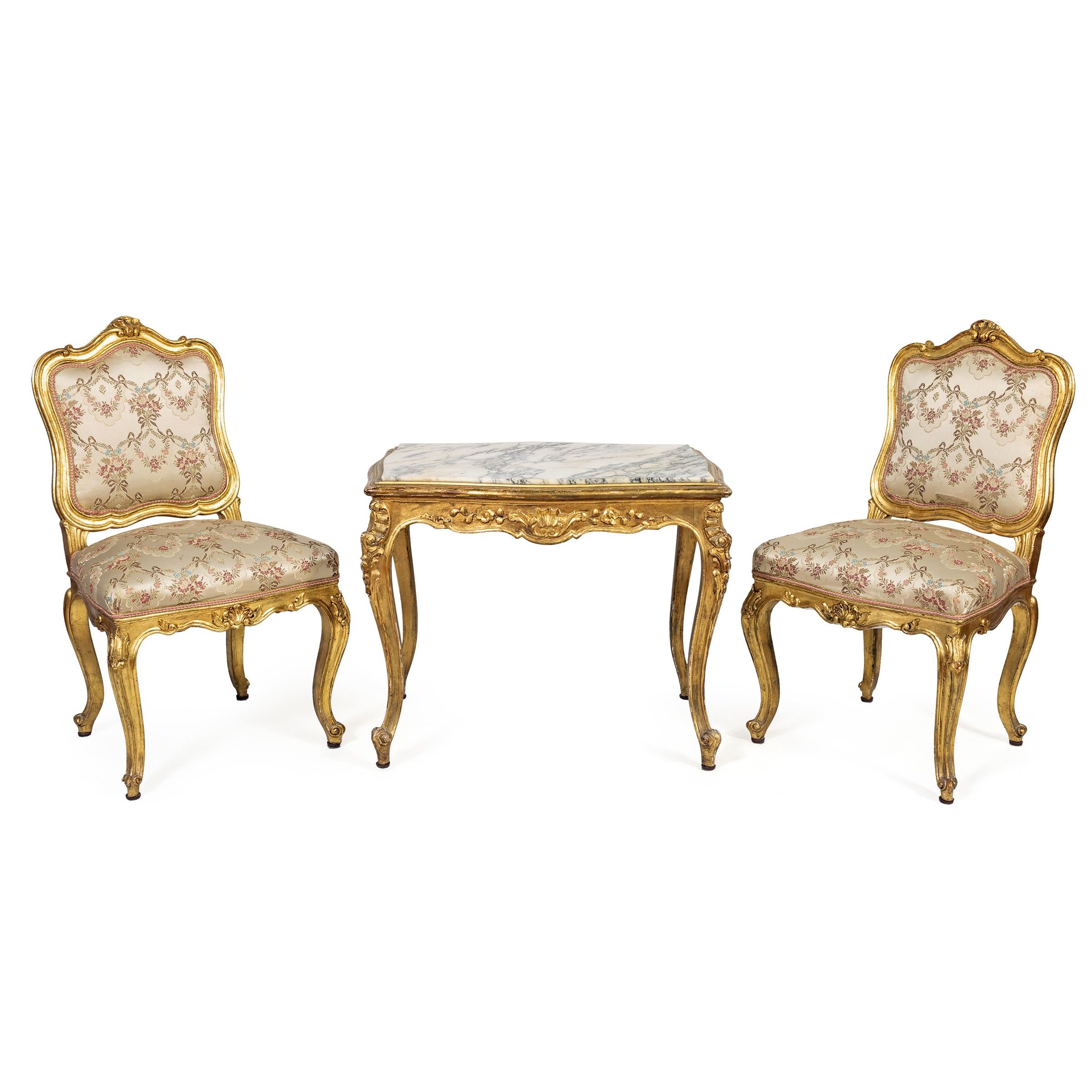 Italia, XX Sec. composto da un divano, una coppia di poltrone, una coppia di sedie ed un tavolino basso con piano in marmo