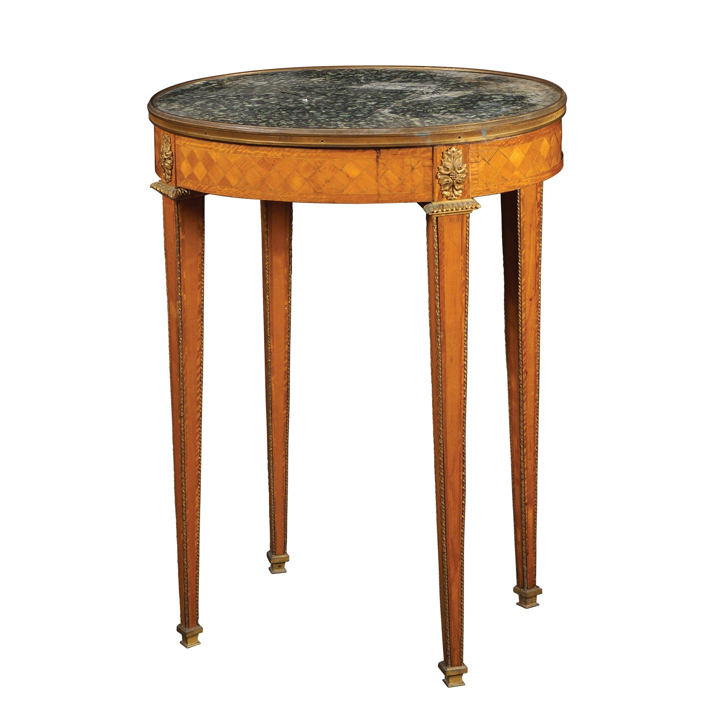70x51x39 cm. Francia, XIX Sec. piano ovale in serpentino verde, delimitato da ringhierina in bronzo dorato, fascia sottostante intarsiata a marqueterie poggiante su gambe troncopiramidali, applicazioni e modanature in bronzo finemente cesellato, lievi difetti