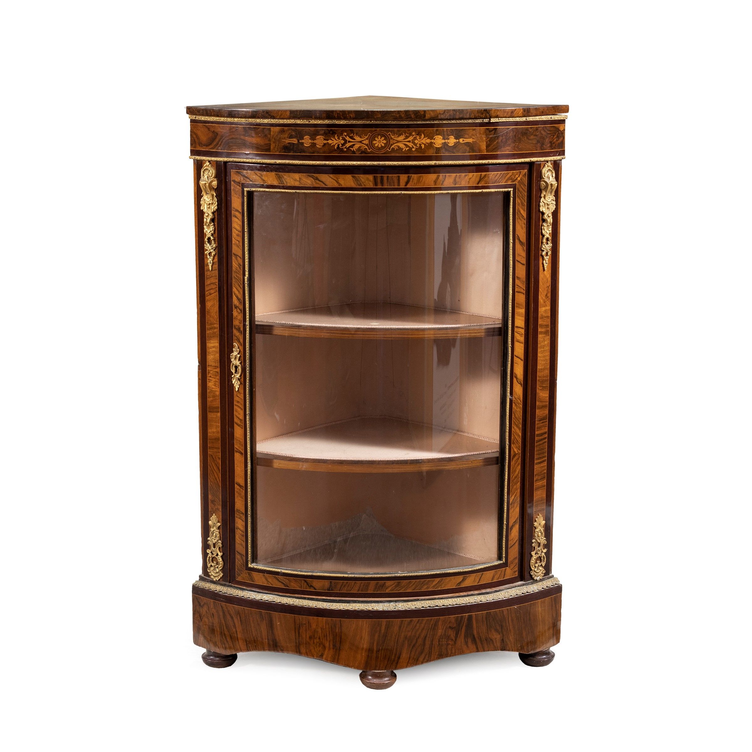 Francia, XIX Sec. in legni vari intarsiati, con applicazioni in bronzo dorato, fronte con uno sportello a vetro