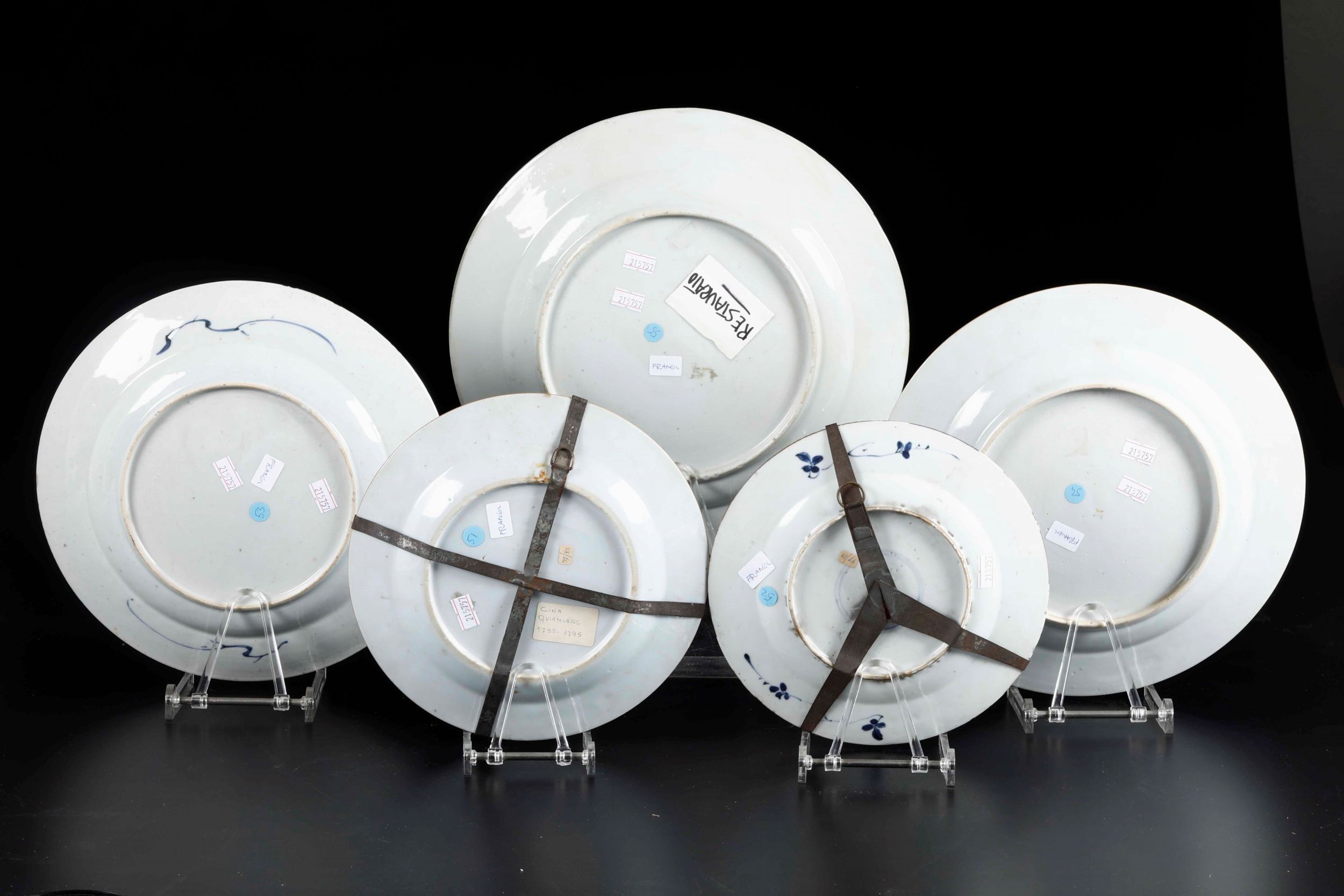 Cinque piatti diversi in porcellana bianca e blu con paesaggi, decori floreali e [..]