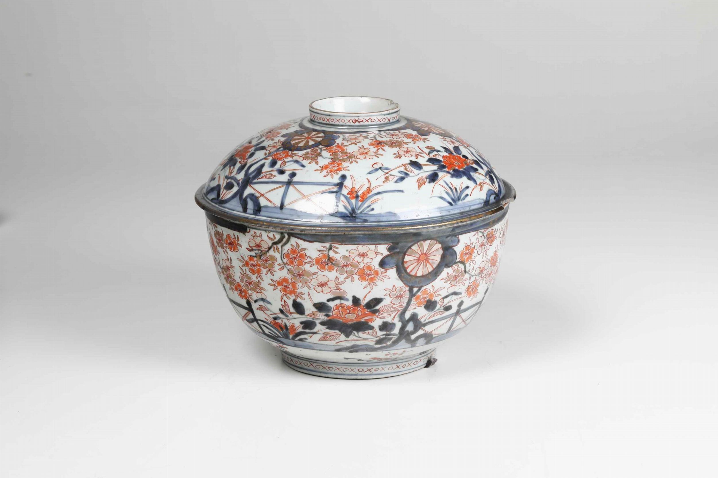 Ciotola con coperchio in porcellana Arita con decori floreali e soggetti naturalistici, [..]