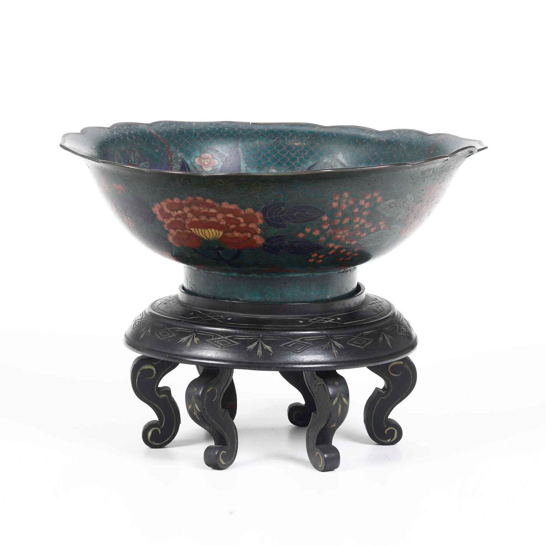 Ciotola in smalto con soggetti naturalistici entro riserve e decori floreali, Cina, [..]
