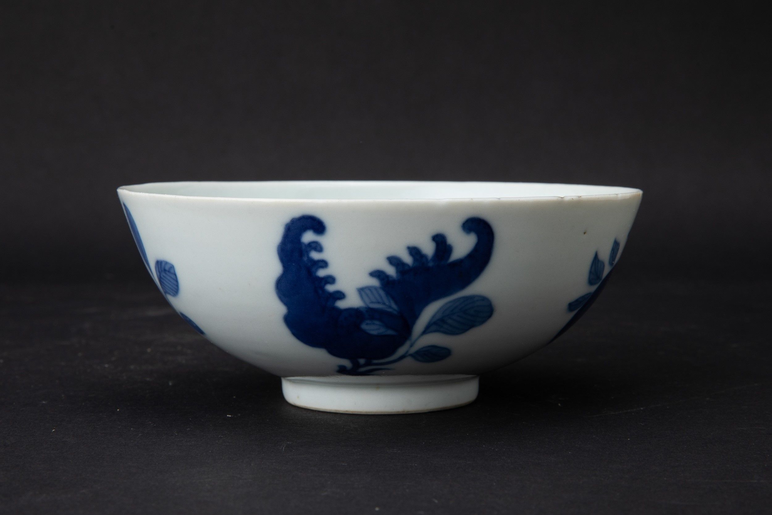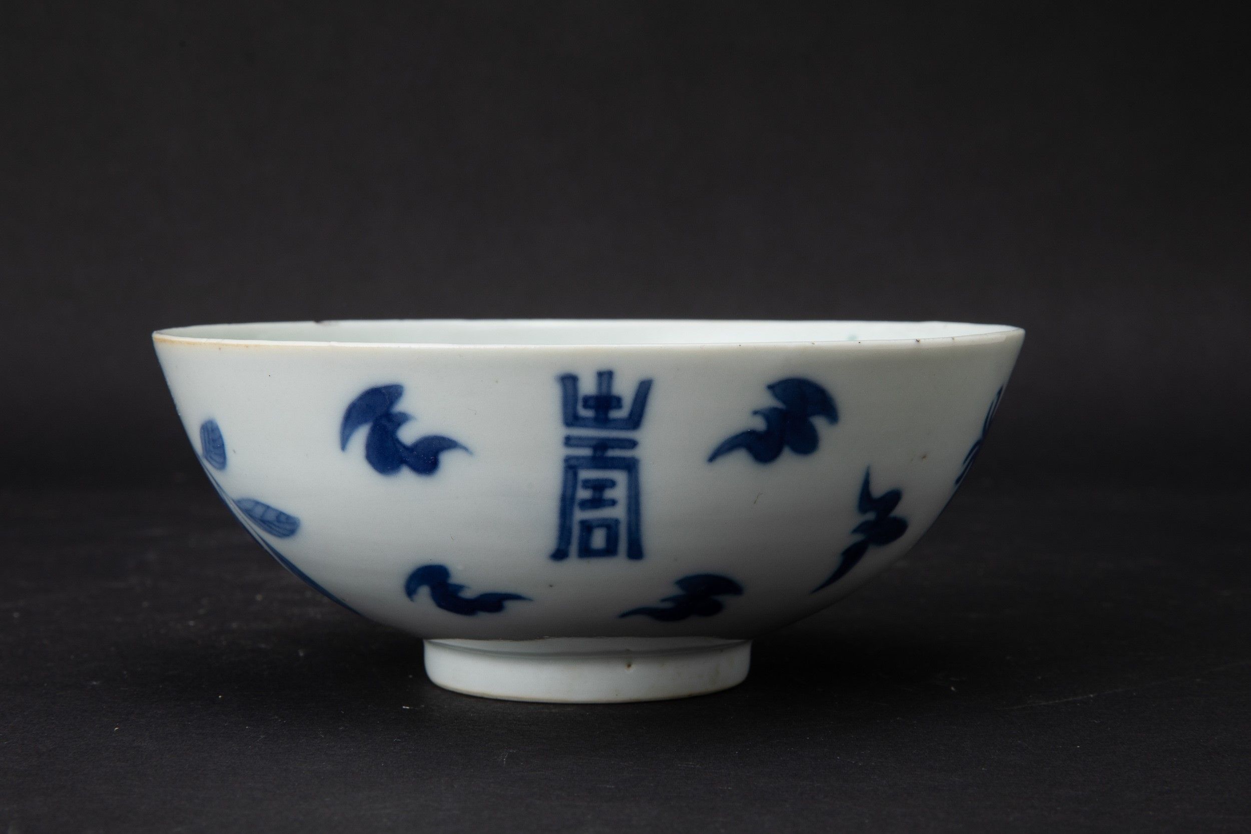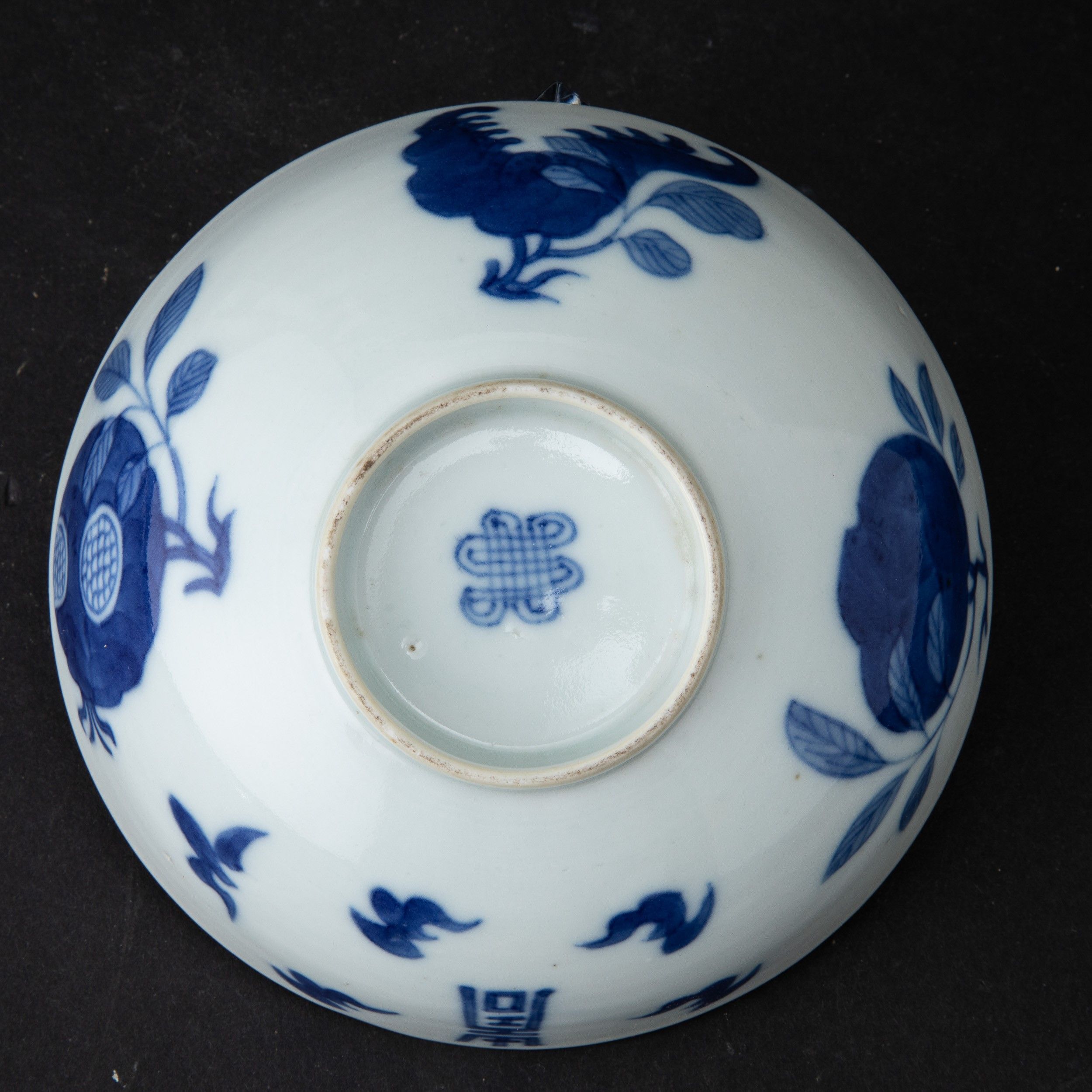 Ciotolina in porcellana bianca e blu con decori a melograno e simboli taoisti, Cina, [..]