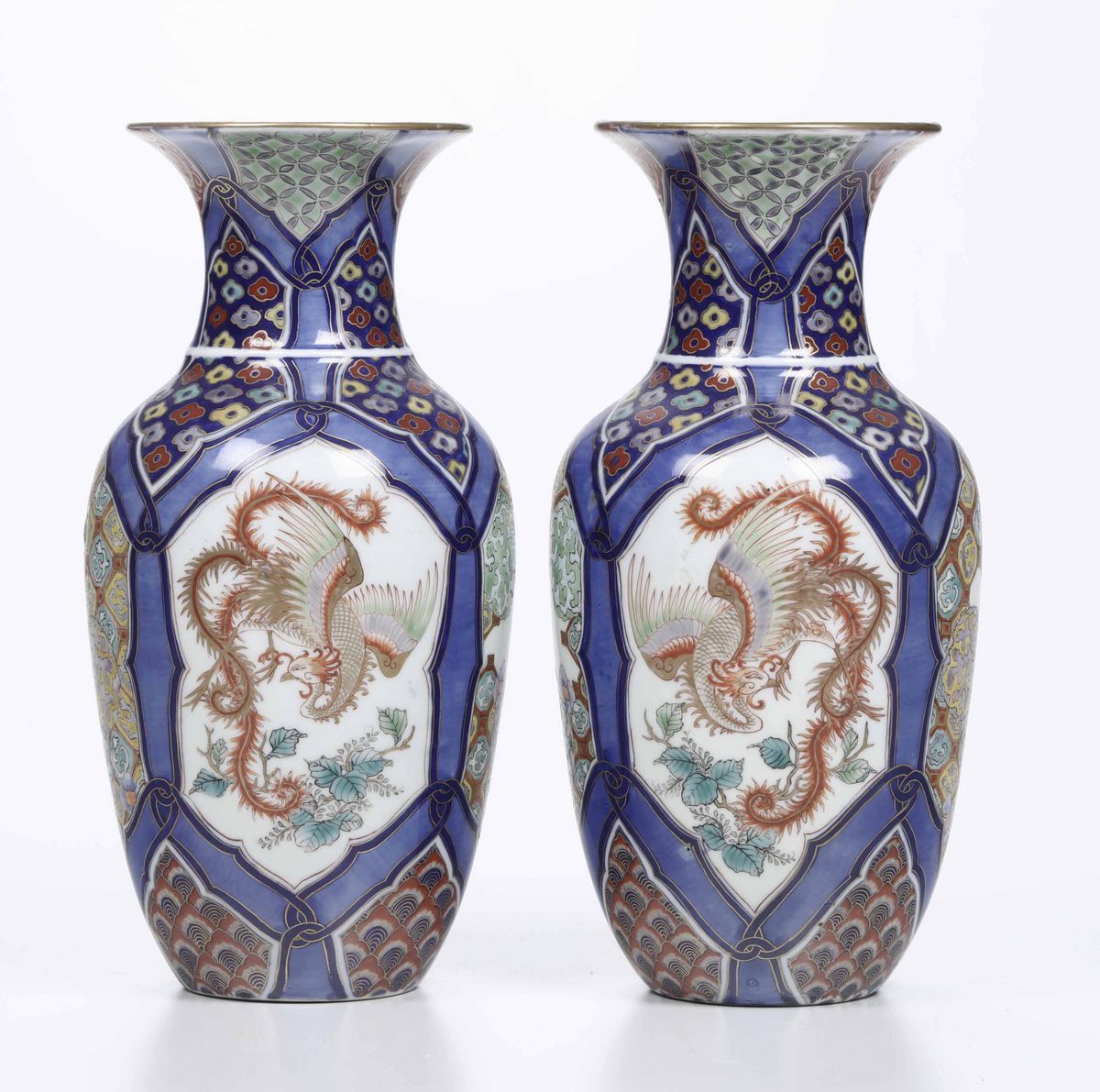 Coppia di piccoli vasi in porcellana con figure di fenici entro riserve, Giappone, [..]