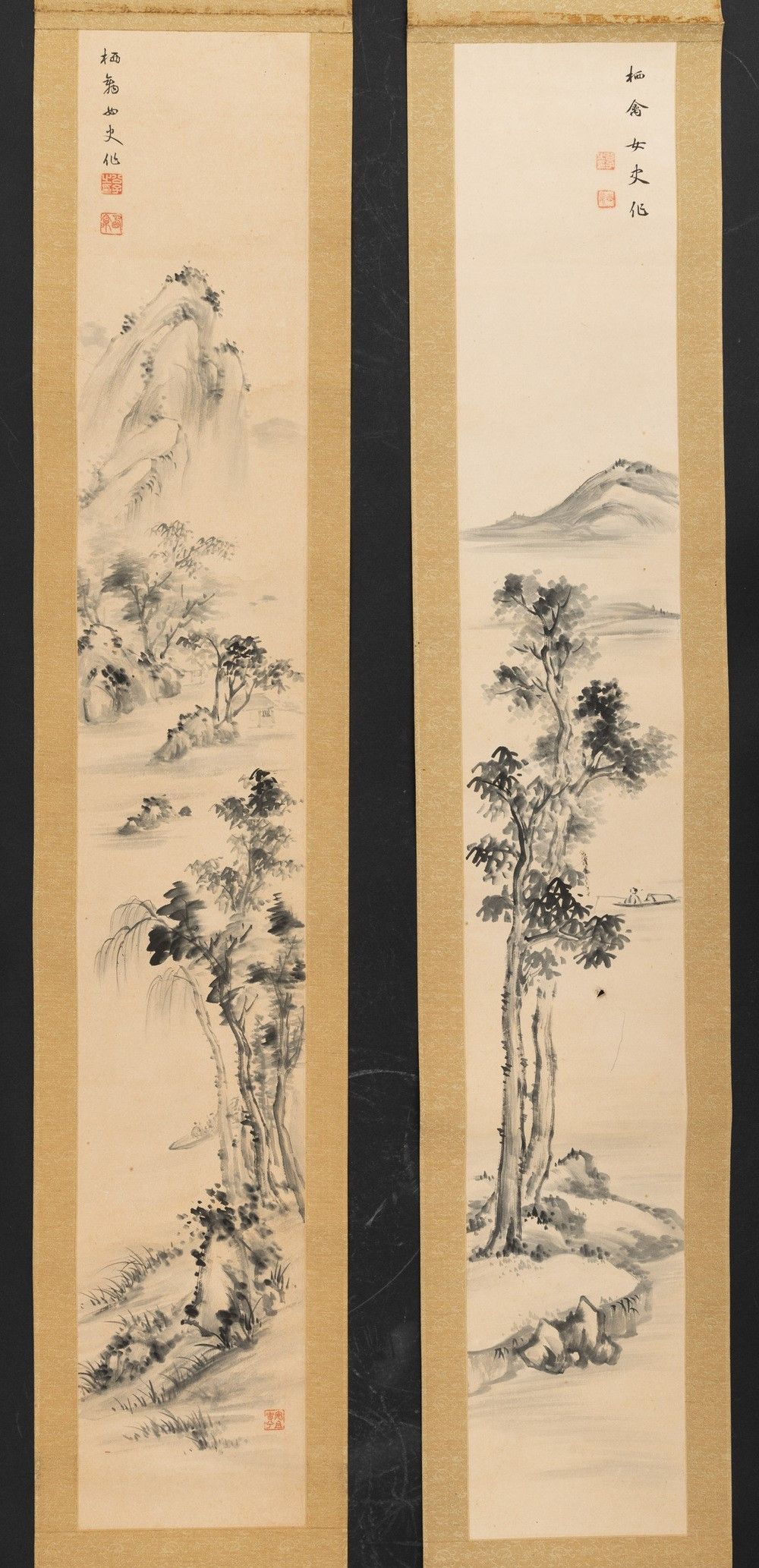 Coppia di scrolls su carta raffiguranti paesaggi e inscrizioni, Cina, Dinastia Qing, [..]