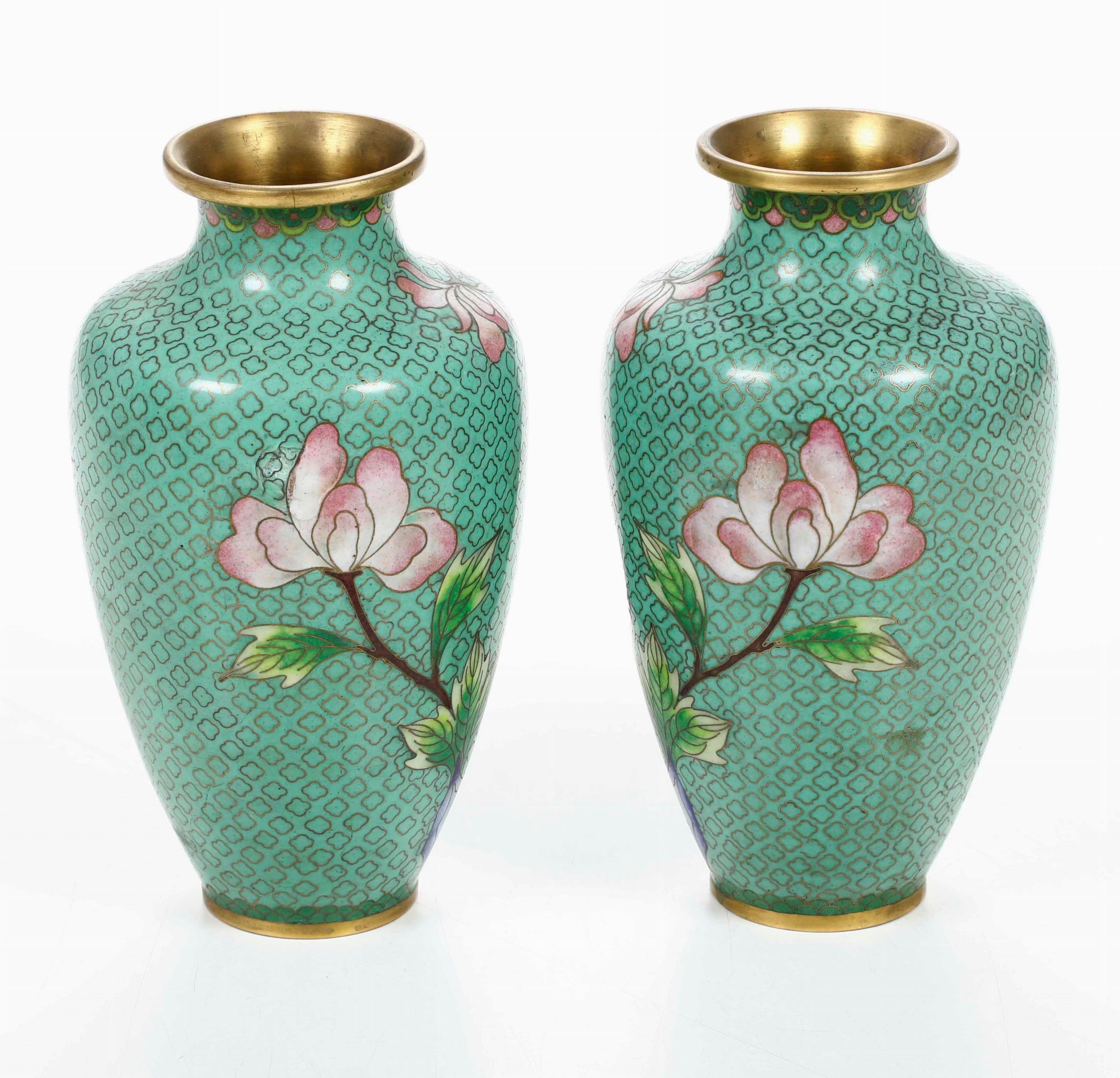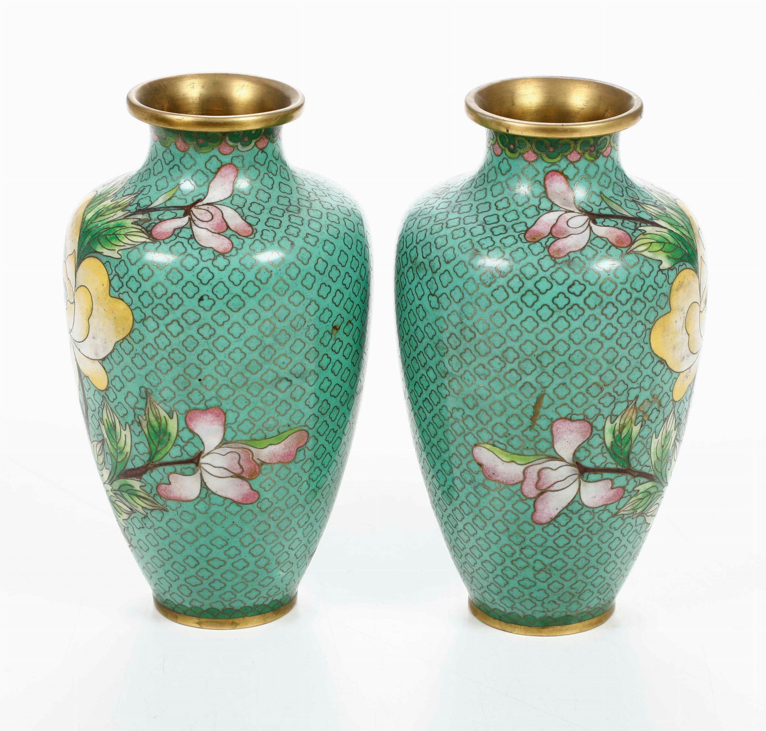 Coppia di vasi in smalto policromo a decoro floreale, Cina, XX secolo