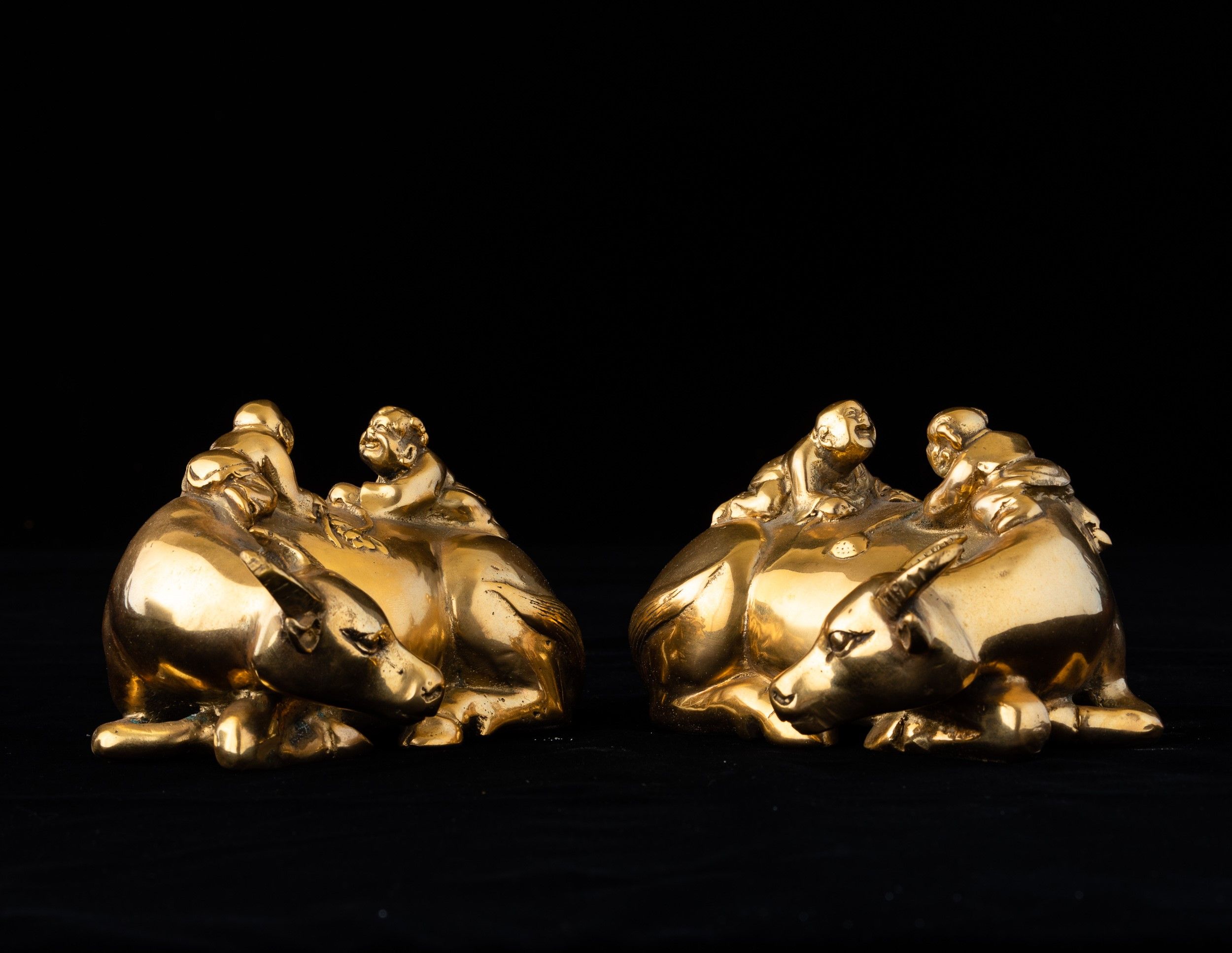 Due figure di buoi con bambini in bronzo dorato, Cina, Dinastia Qing, XIX secolo