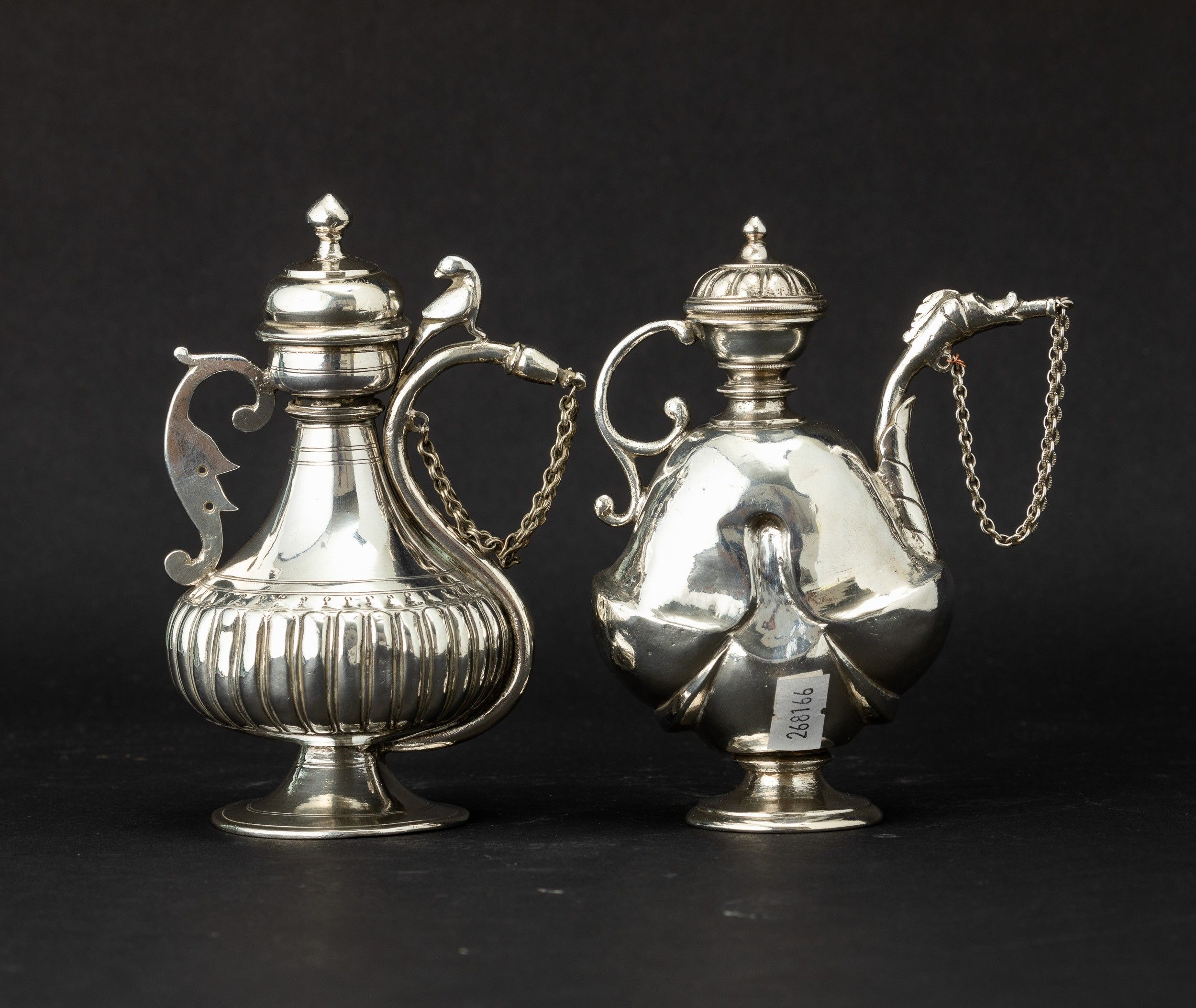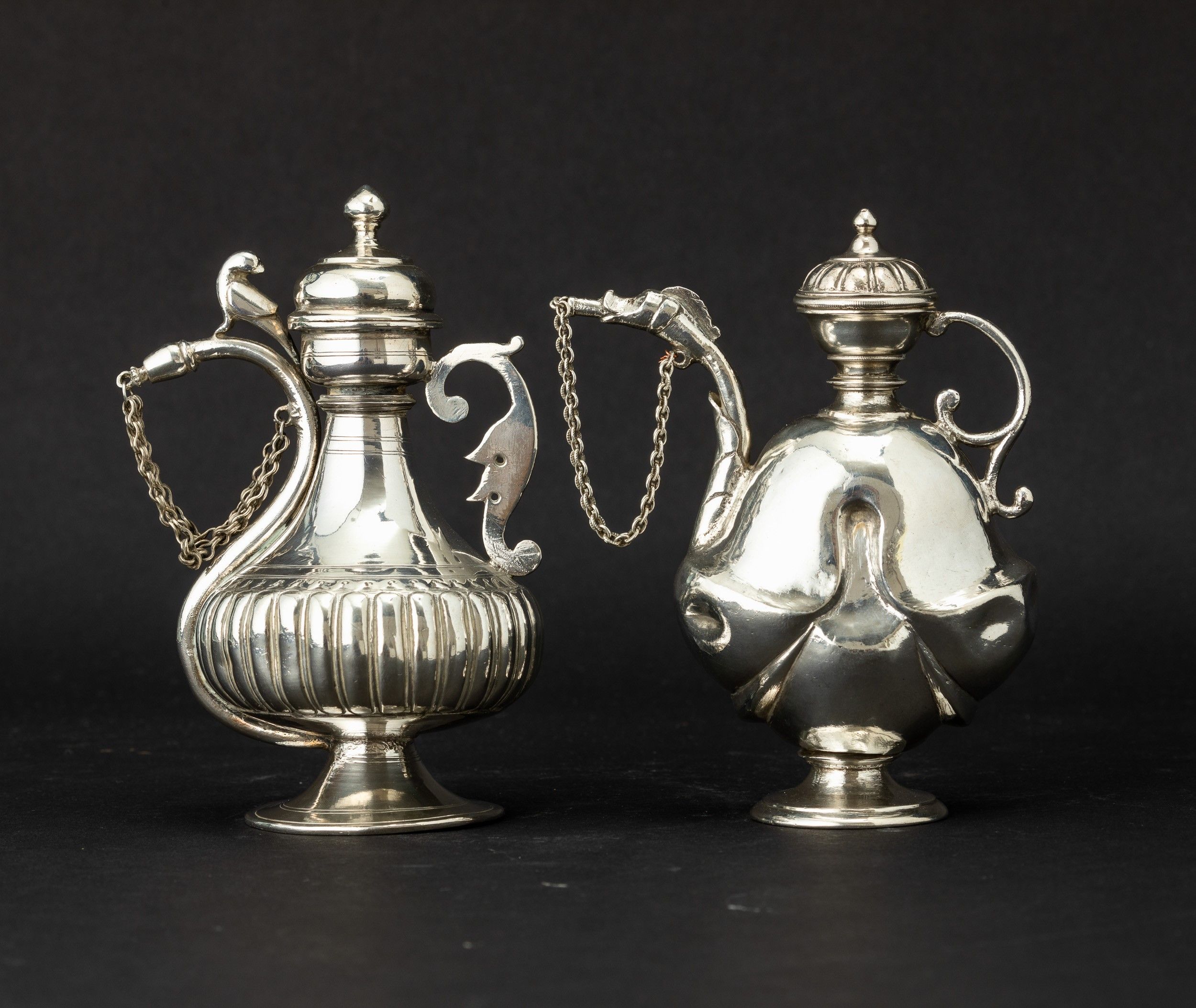 Due piccole fiasche d’argento con coperchio e beccuccio con chiusura a catenina, [..]