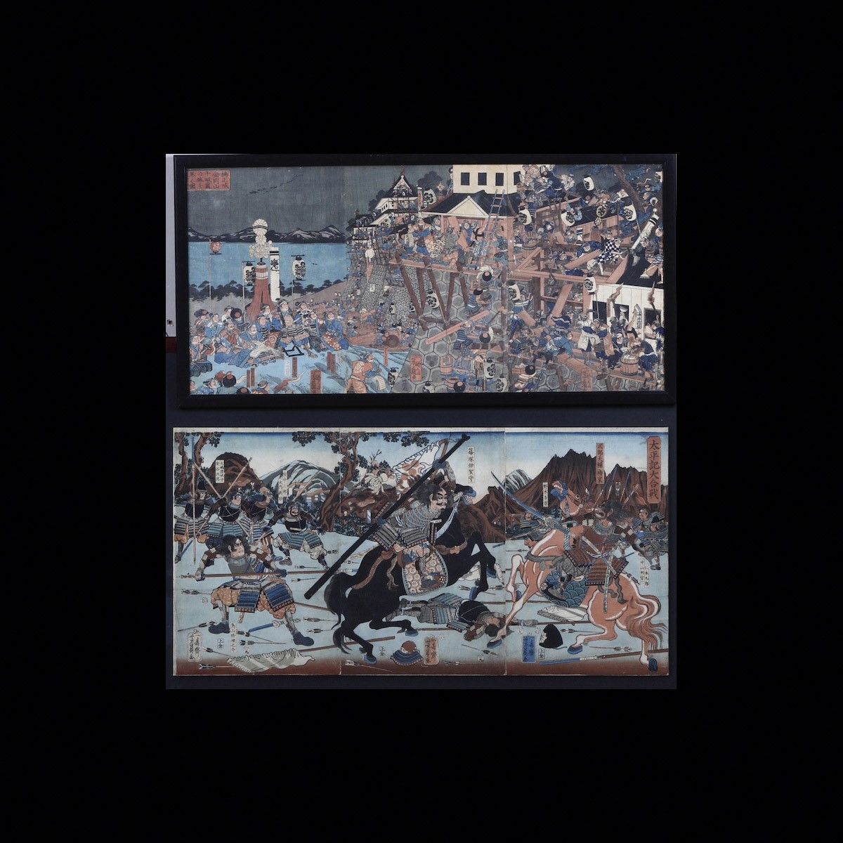 Due xilografie su carta raffiguranti scene di battaglia con cavalieri, Giappone, [..]