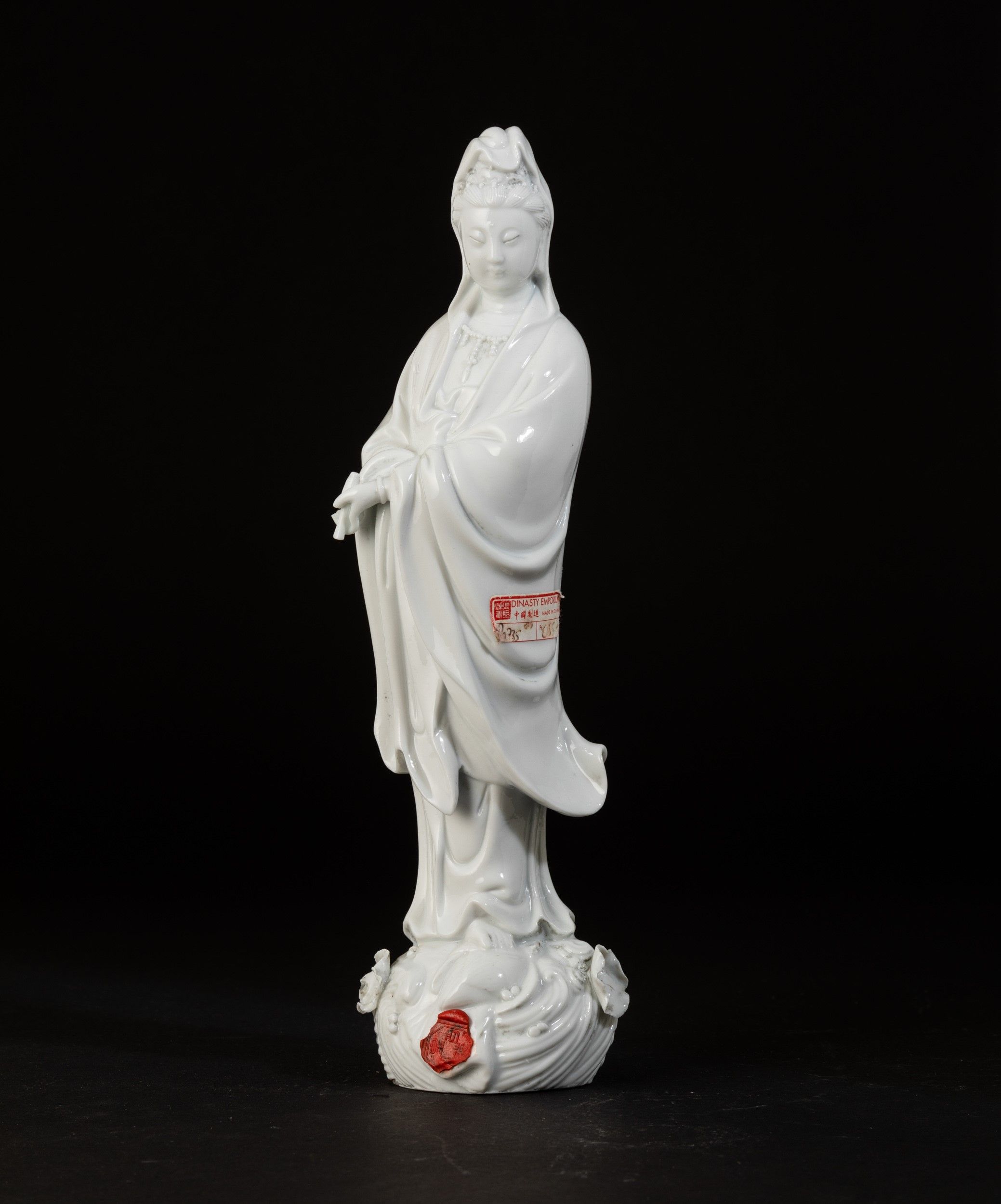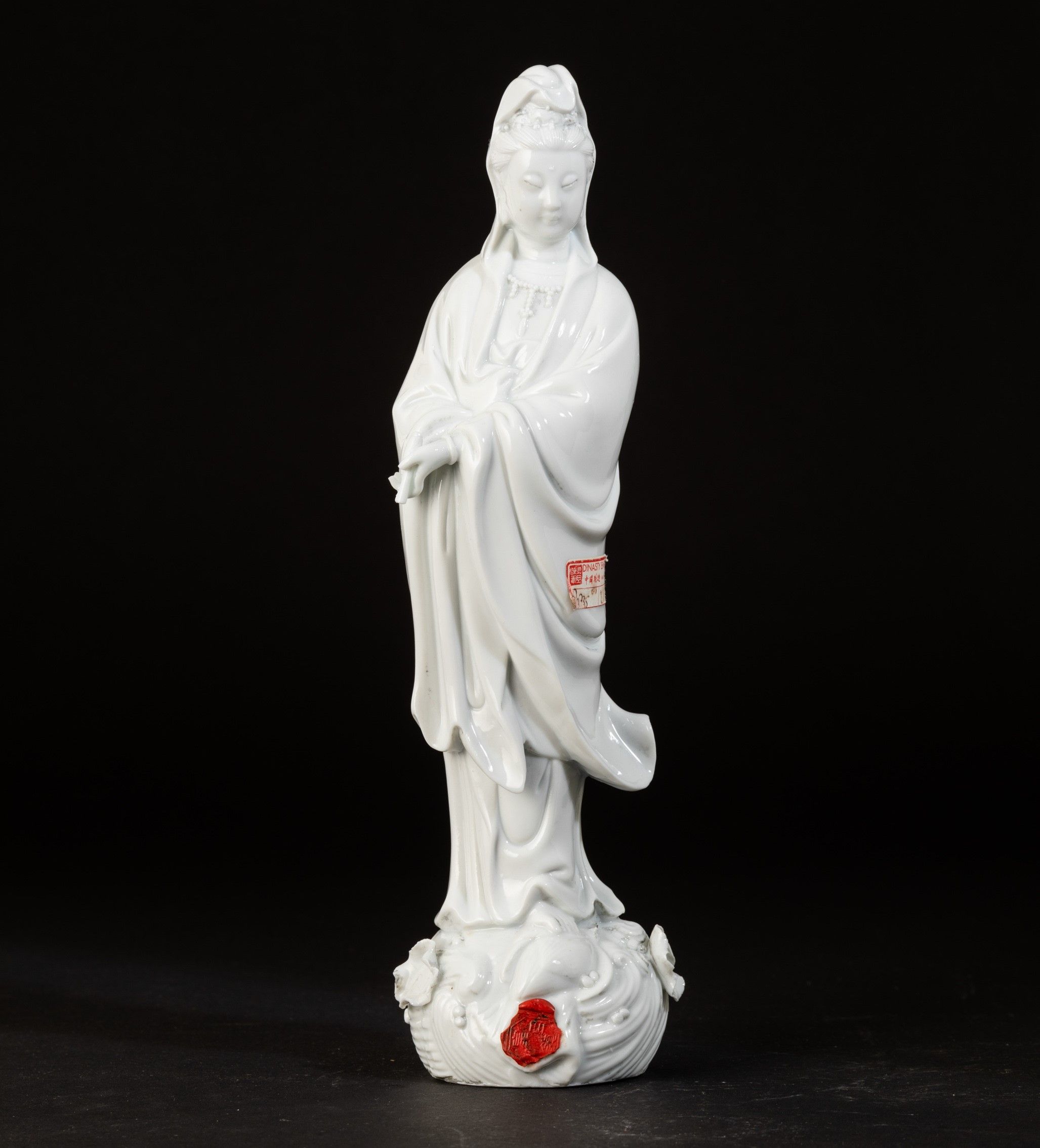 Figura di Guanyin con scroll in porcellana Blanc de Chine, Cina, XX secolo