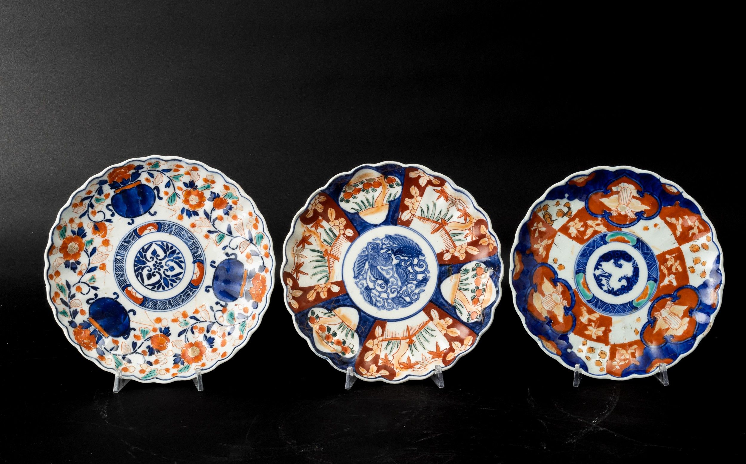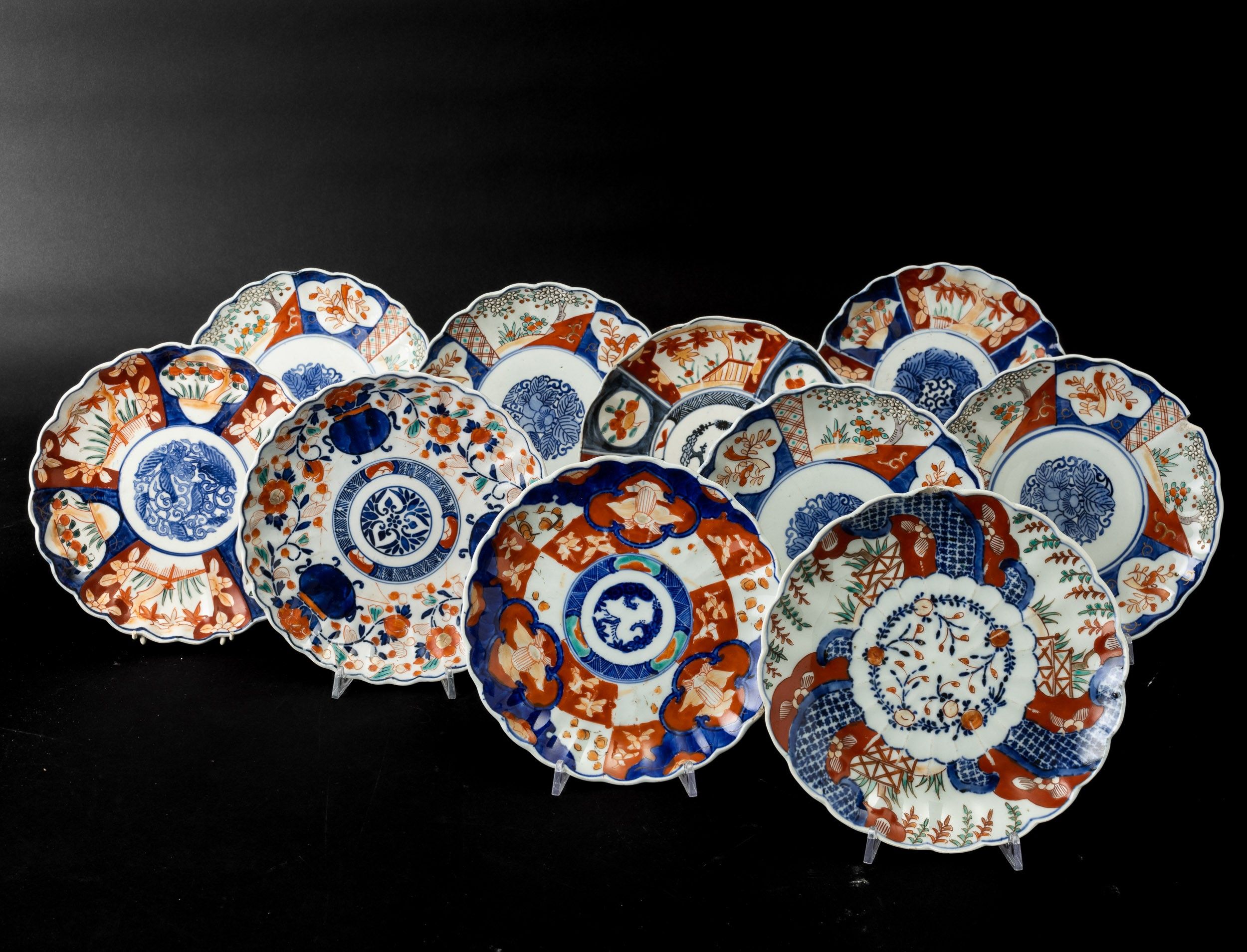 Lotto composto da dieci piatti in porcellana Imari con decori floreali entro riserve, [..]