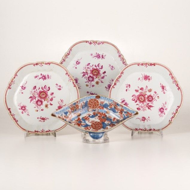 Lotto composto da tre piatti sagomati a decoro camailleux e una salsiera in porcellana [..]