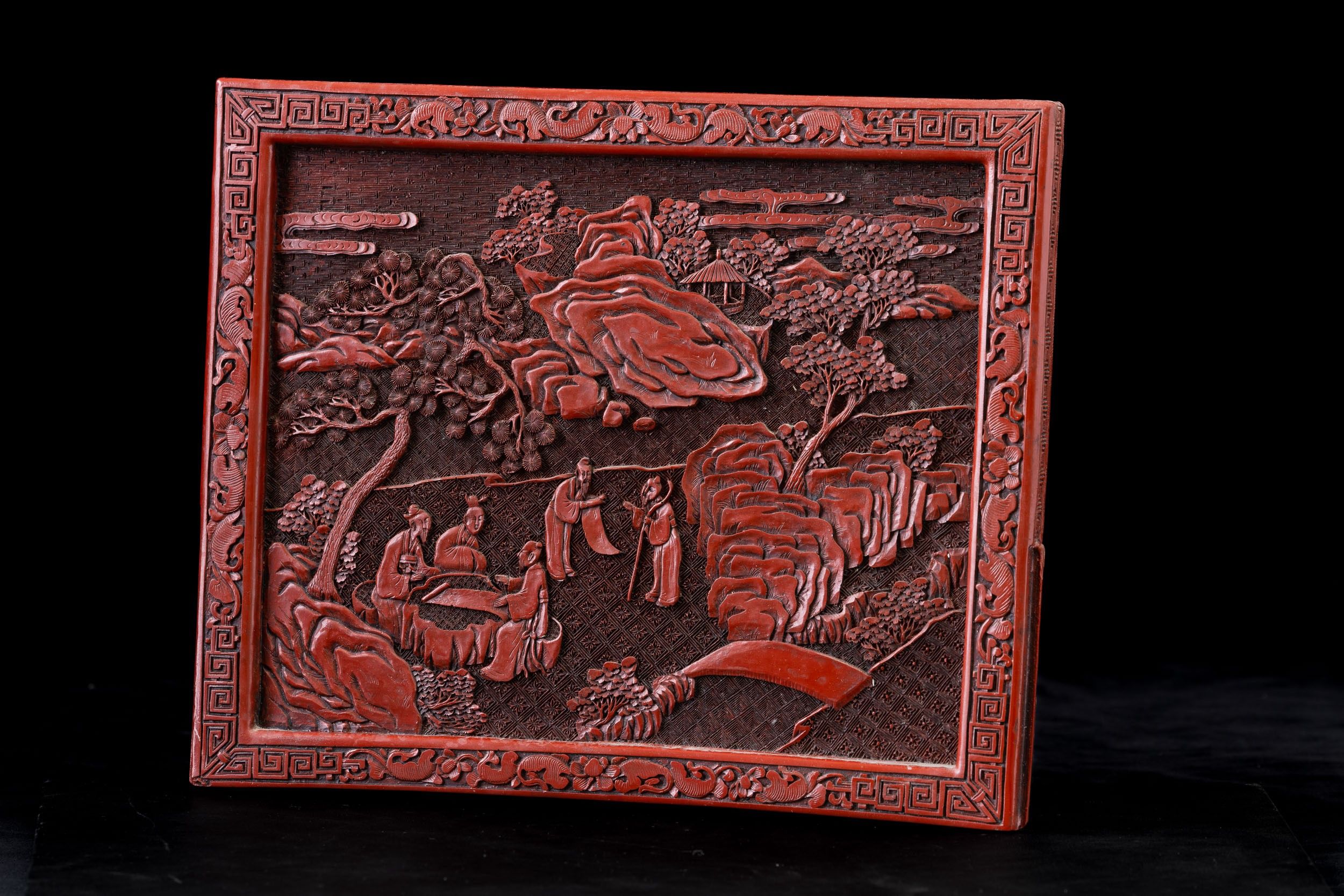 Paravento da tavolo con placca in lacca rossa raffigurante saggi entro paesaggio [..]