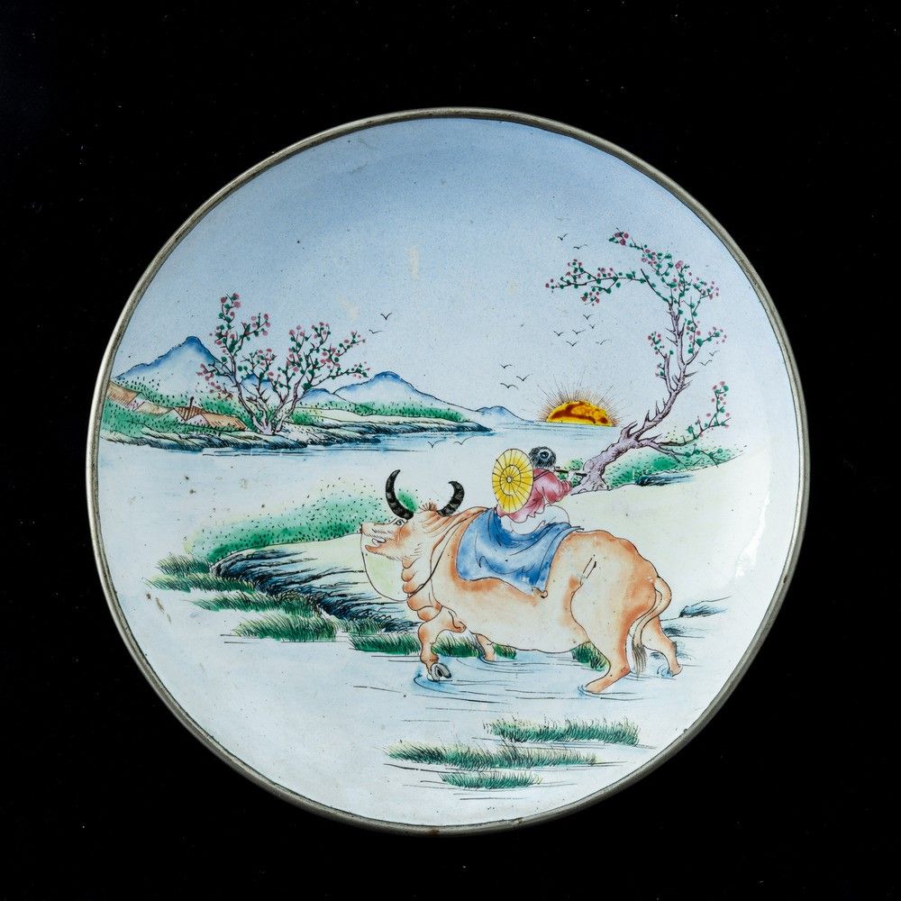 Piatto in smalto raffigurante paesaggio con bue e fanciullo, Cina, Dinastia Qing, [..]