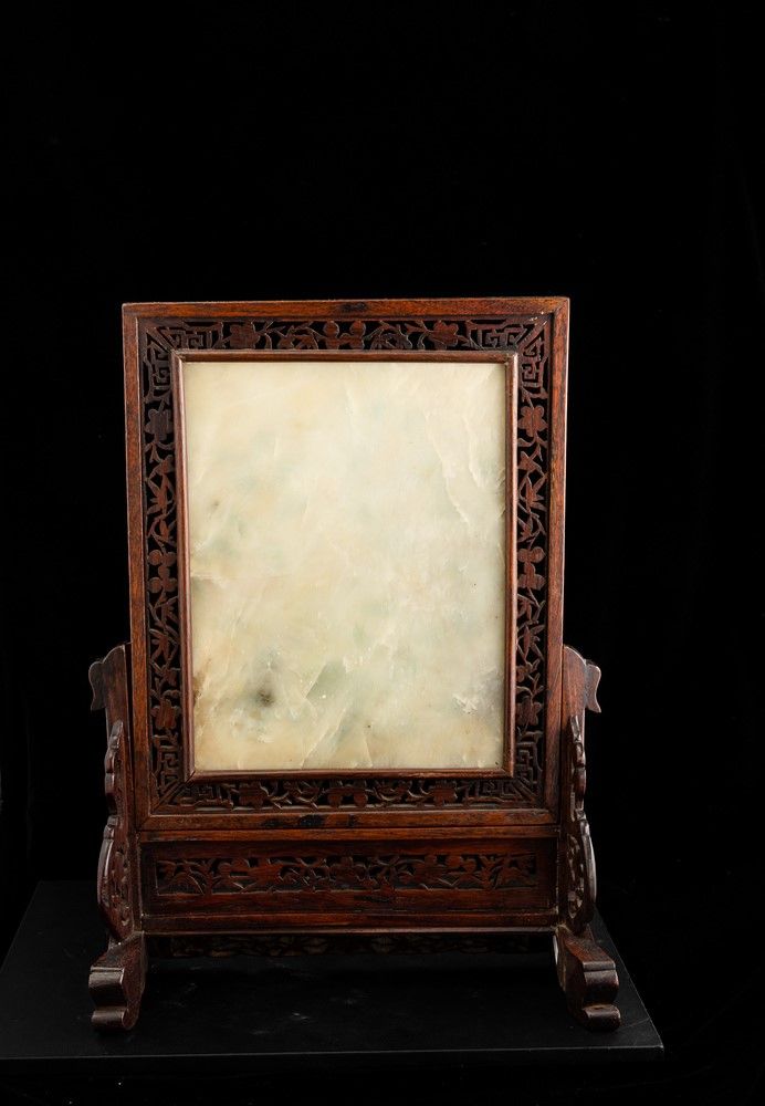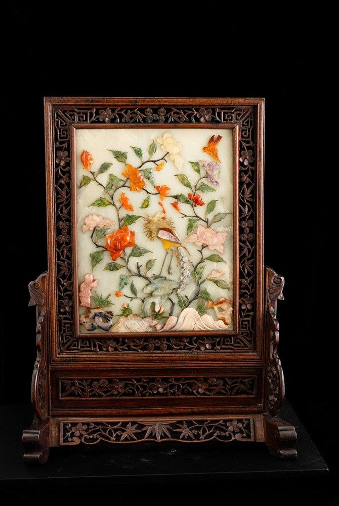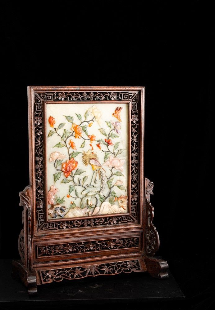 Piccolo paravento da tavolo con placca in giada raffigurante soggetto naturalistico [..]